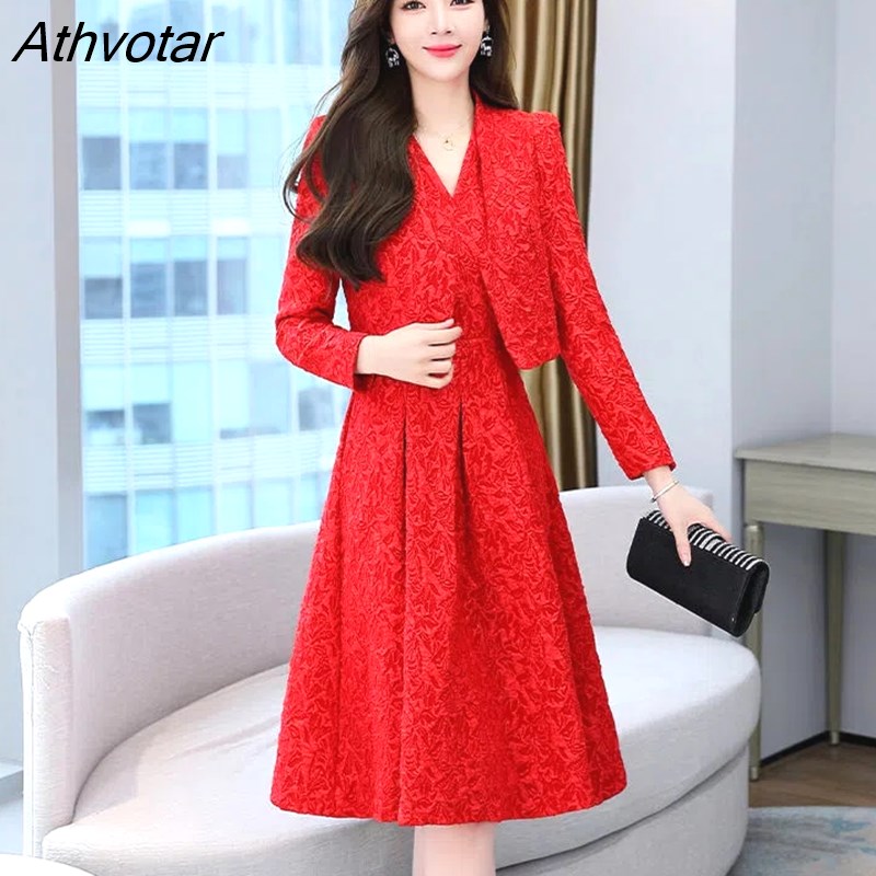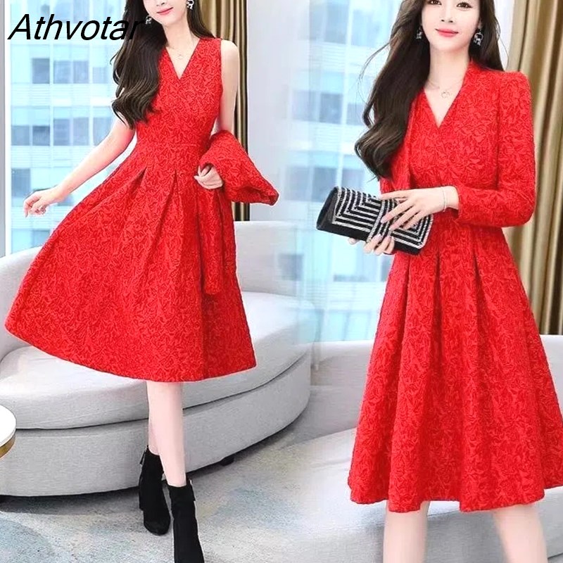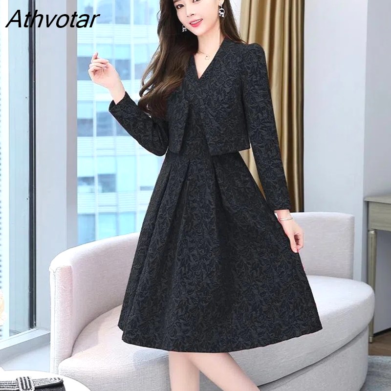 Athvotar Jacquard Dress Suit Korean V Neck Pleated A-Line Tank Dresses Matching Cardigan Ensemble Femme 2 Piece Set Women Outfits