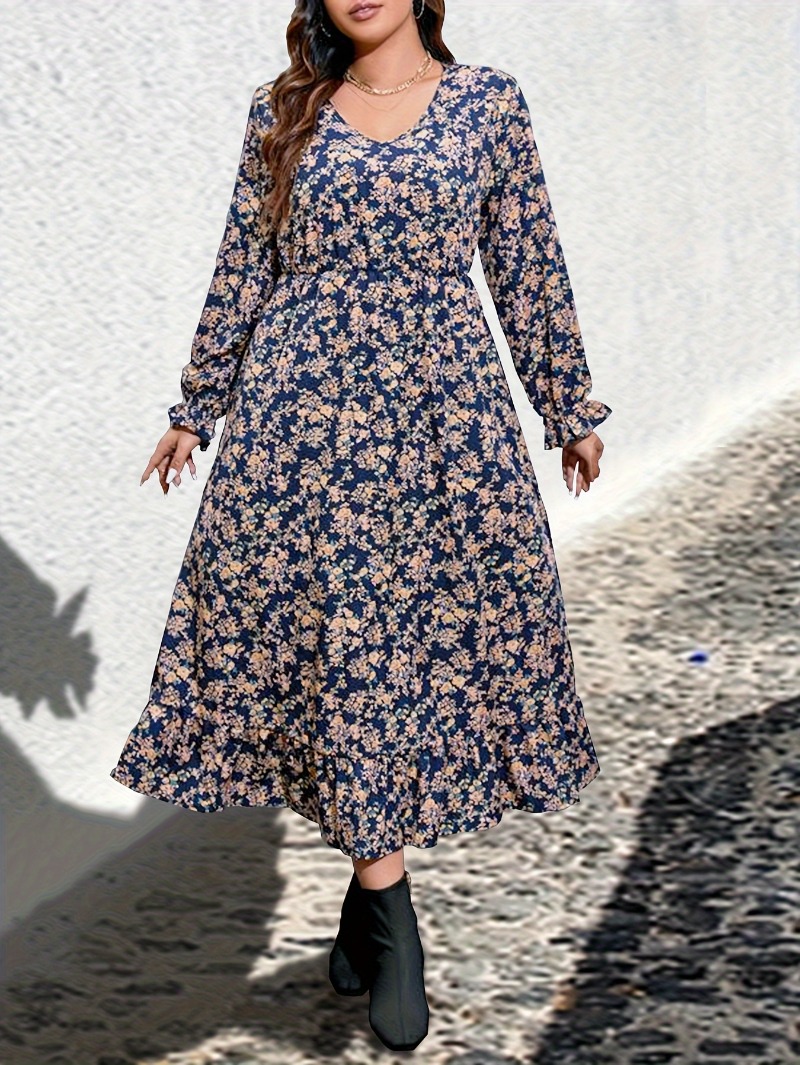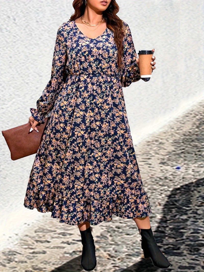 Athvotar Size 1XL-5XL Casual Dress Women's Plus Floral Print Lantern Sleeve V Neck Smock Dress