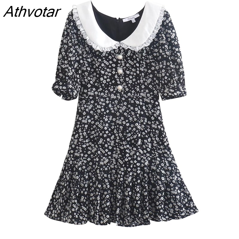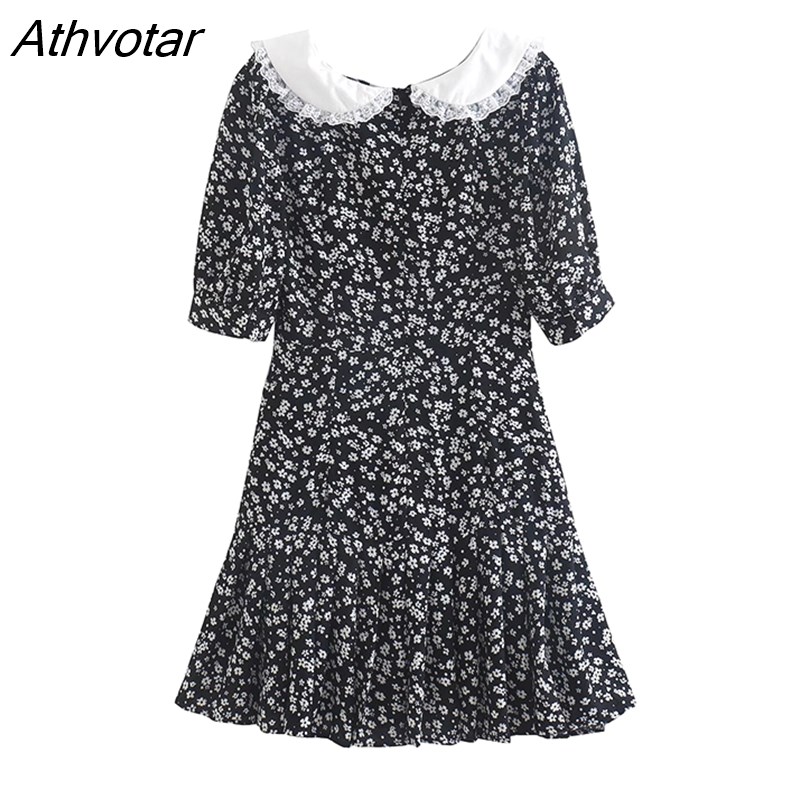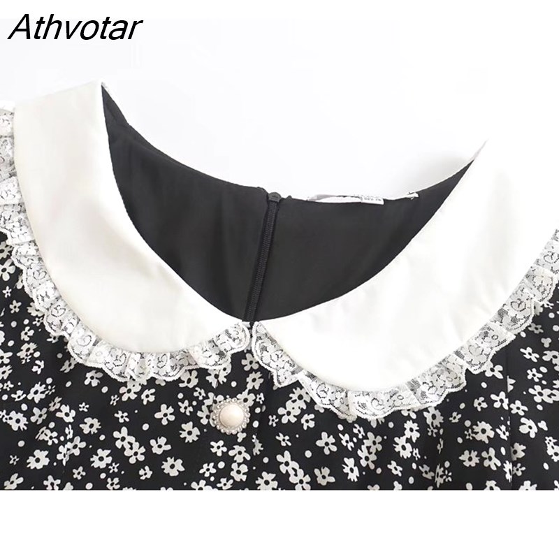 Athvotar Summer 2023 Women Lace Patchwork Peter Pan Collar Floral Print Dress Puff Sleeve Ladies Vintage Dress Chiffon Short Robe
