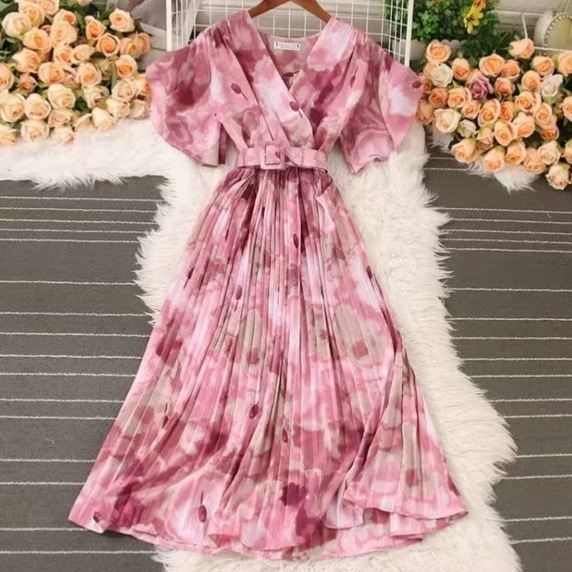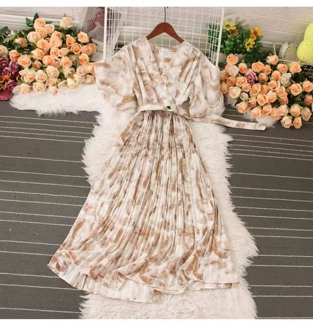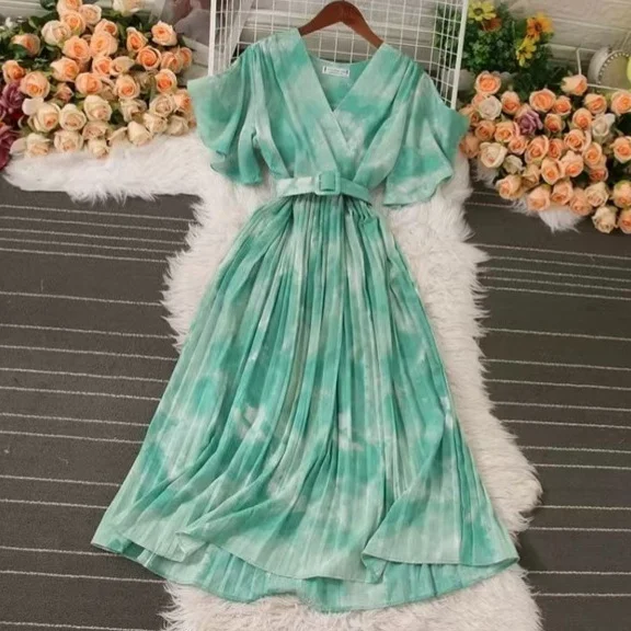 Athvotar Athvotar French Crumlom Dyed Summer New Waist Display Thin And Long Elegant Folded Chiffon Dress Holiday Woman