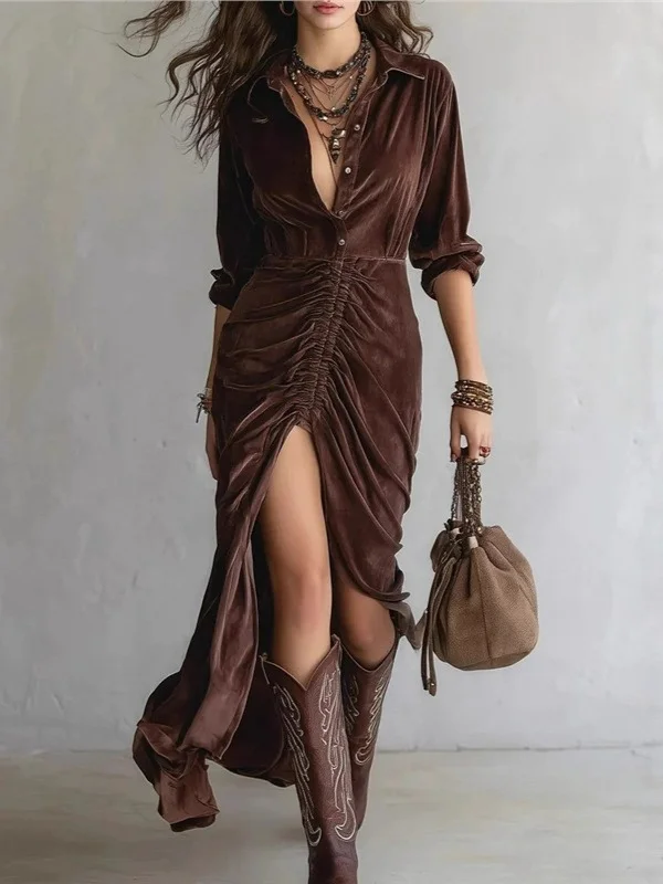 Athvotar Athvotar 2025 Fashion Button Folded Velvet Long-Sleeved Shirt Dress