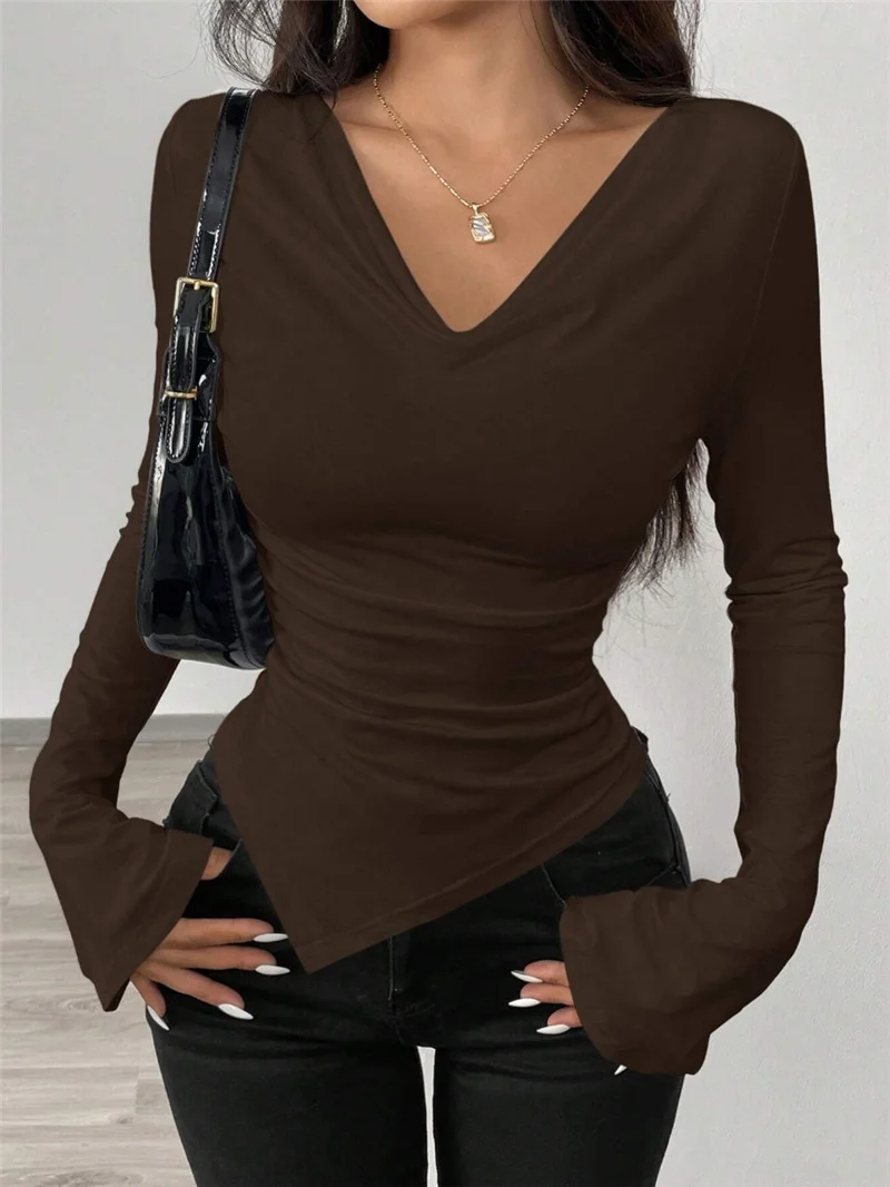 Athvotar Athvotar And Summer New V-Neck Open Shoulder Two-Wear Design Embody Wrinkles Irregular Long-Sleeved T-Shirt