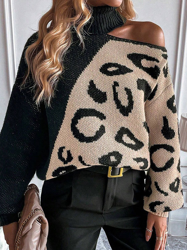 Athvotar Athvotar And Winter New Sweater Women Feel Shoulder Leopard Splicing High-Neck Knitting Shirt Factory