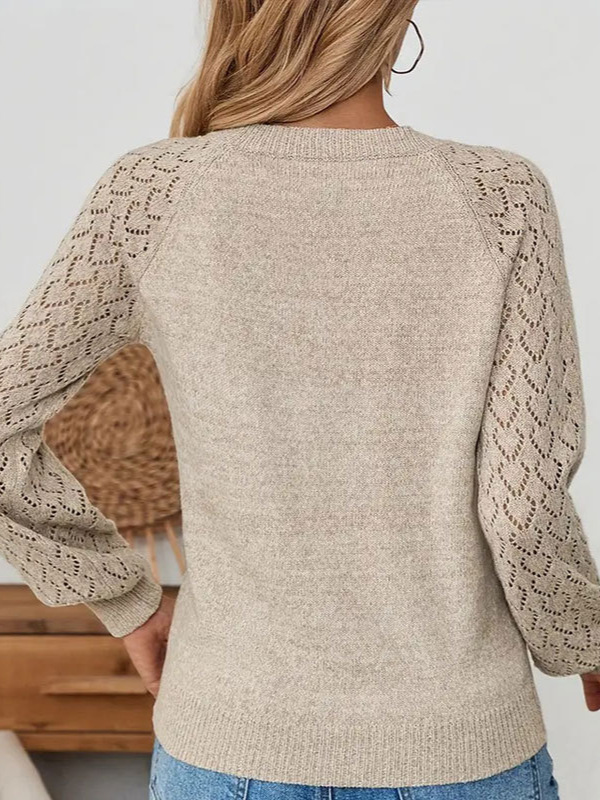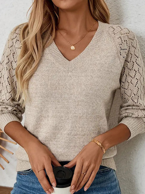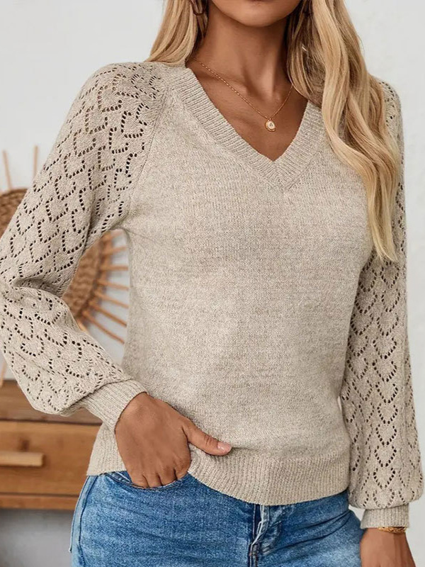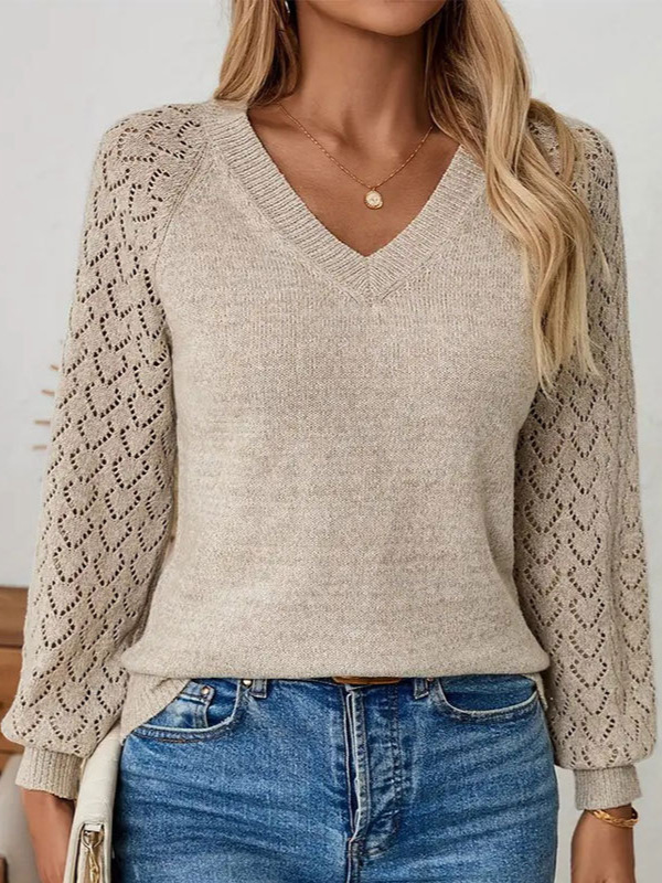 Athvotar Athvotar And Winter Sweater Women's Clothing Solid Color Knitting Long-Sleeved Hooks And Flowers Loose V-Neck Bottom Top