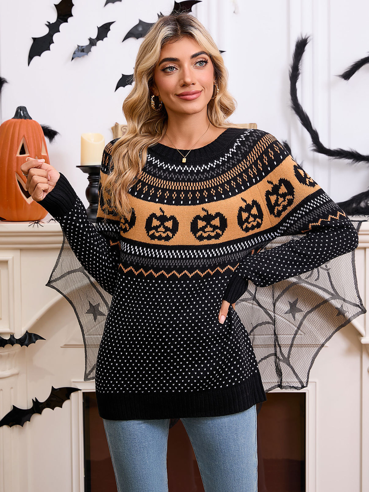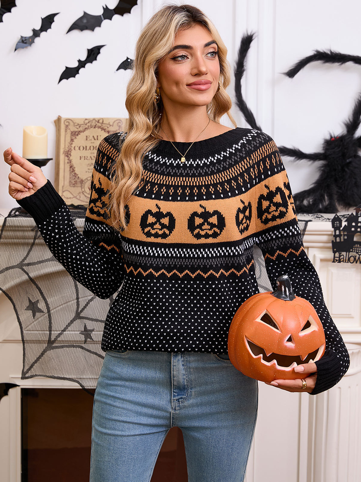 Athvotar Athvotar And Winter Sweater Women's Halloween Pumpkin Embroidery Retro Wave Point Long-Sleeved Knitted Shirt Girl