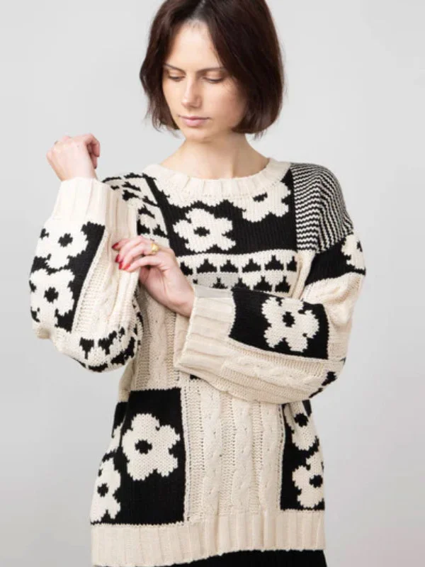 Athvotar Athvotar And Winter Sweater Women's Square Flowers Casual Loose Round Collar Knitted Shirt