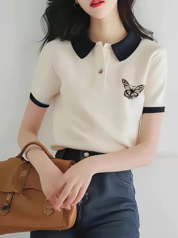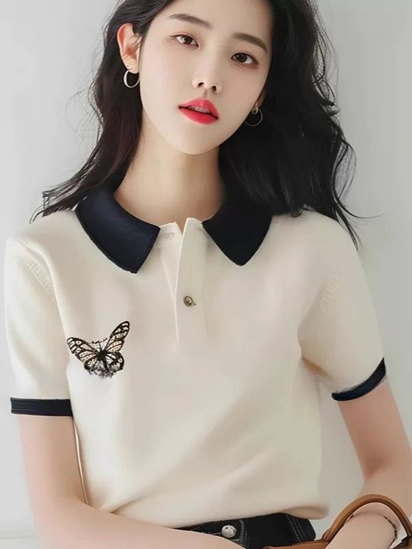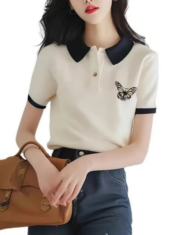 Athvotar Athvotar Butterfly Polo Collar Short-Sleeved T-Shirt Girl 2025 Summer Simple Fashion Does Not Hit The Unique Beauty Of The Top Woman