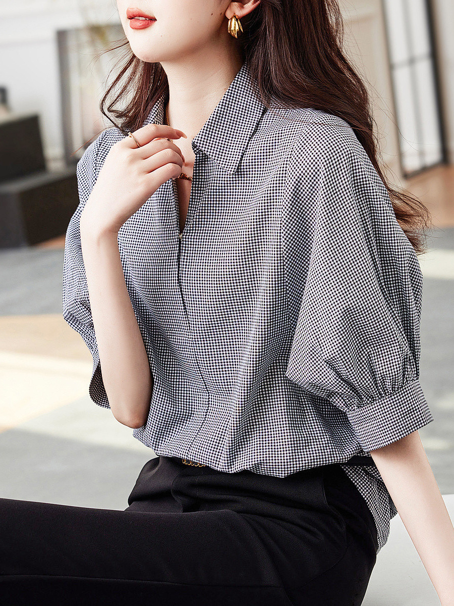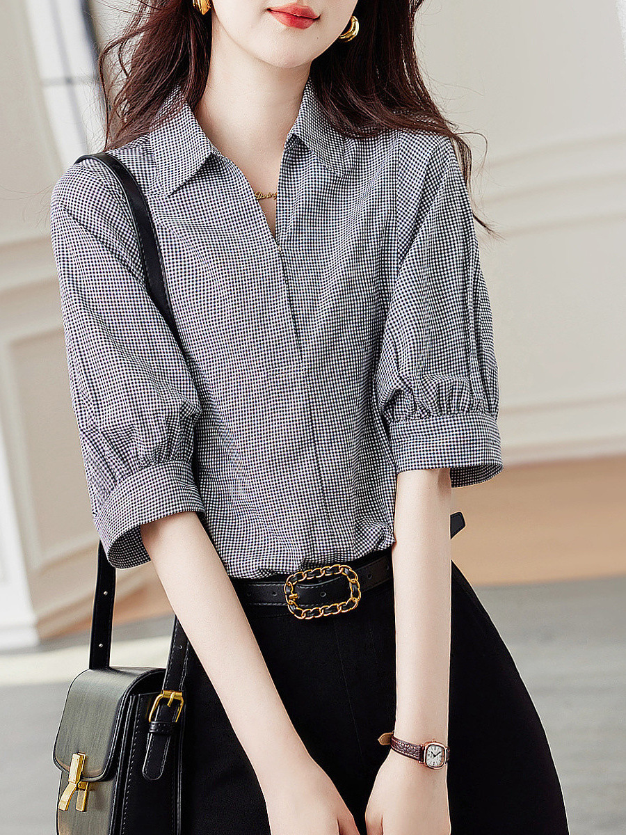 Athvotar Athvotar Casual Design Cotton Checker Shirt 2025 Summer New Collar Short-Sleeved Shirt Women's New Top