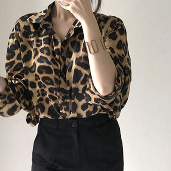 Athvotar Athvotar Chic Autumn Vintage Leopard Print Collar Single Buckle Loose Leisure Long-Sleeved Shirt Topess