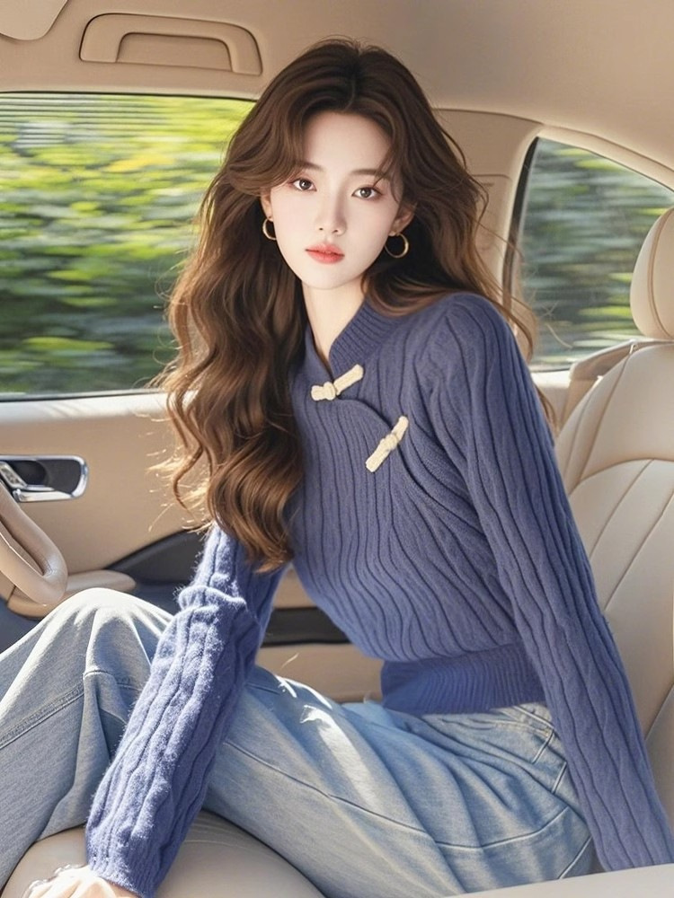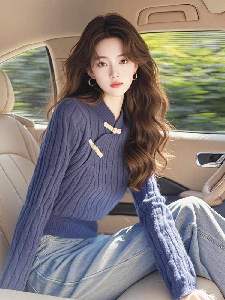 Athvotar Athvotar Chinese Style Blue Retro Collared Knitted Bottom Shirt 2025 Autumn And Winter New Chic Long-Sleeved Top
