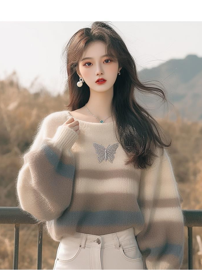 Athvotar Athvotar Fashion Style Sweater Korean Soft-Creative Languid Lazy Super-Good-Looking White Striped Print Sweater
