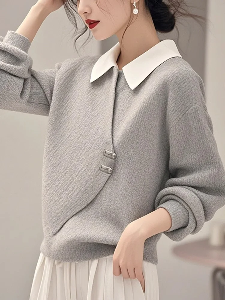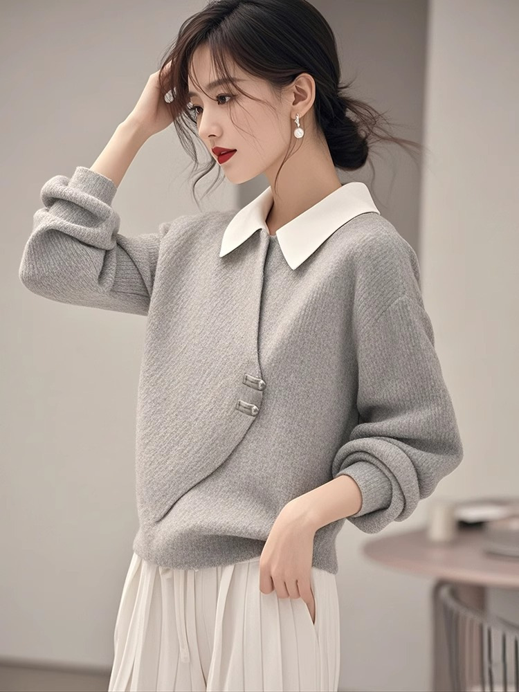 Athvotar Athvotar Gray Fake Two Knitted Sweater Women's Autumn And Winter Korean Atmosphere Relaxed Leisure Polo Collar Top