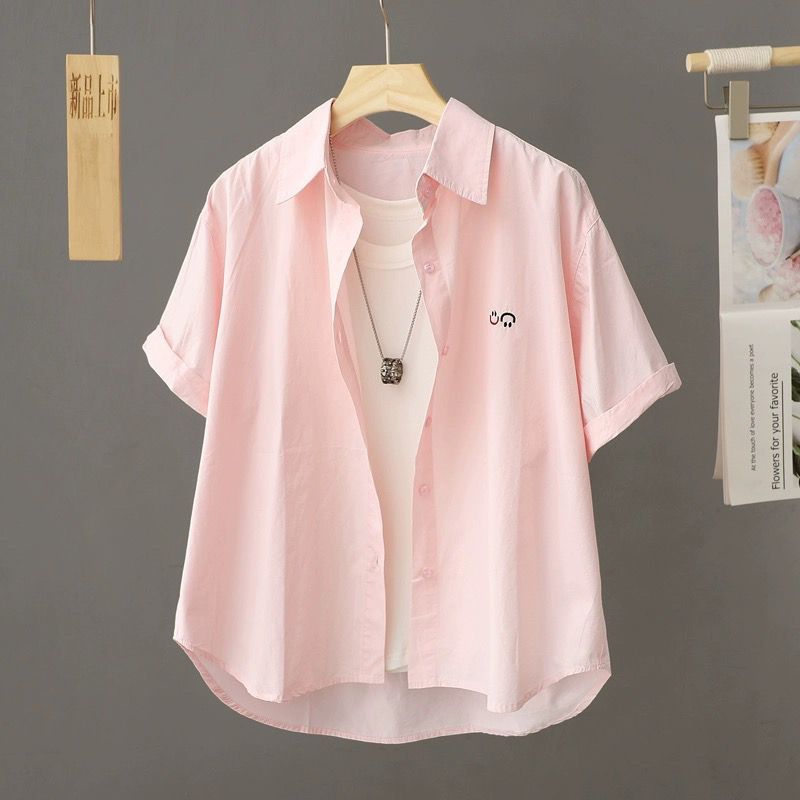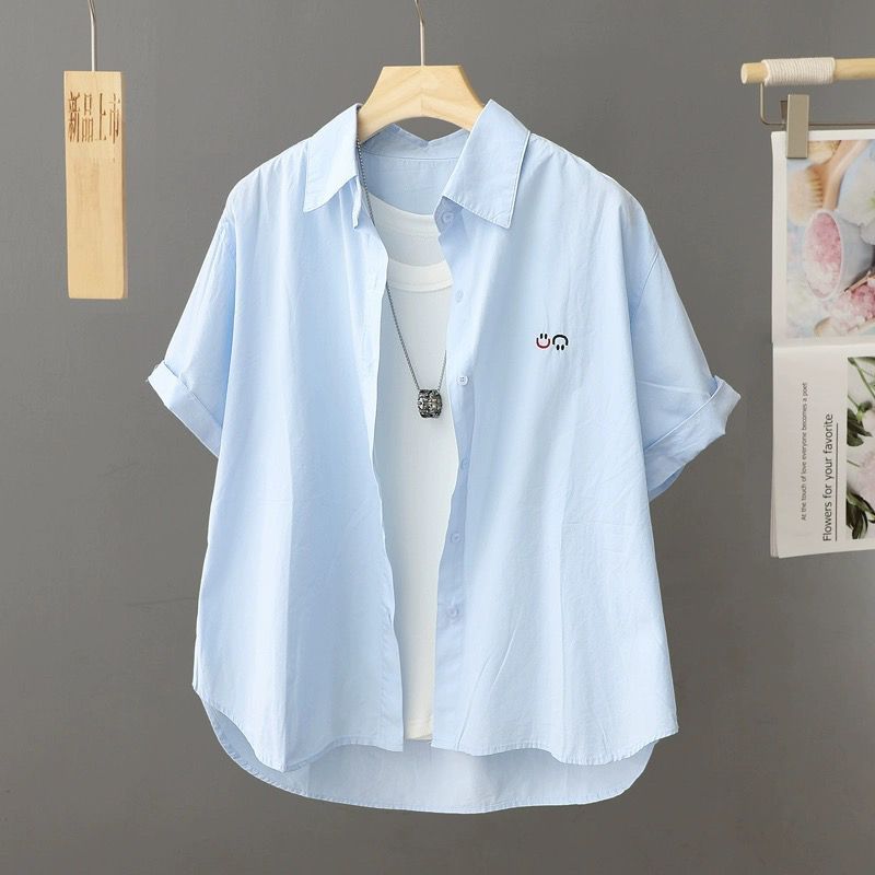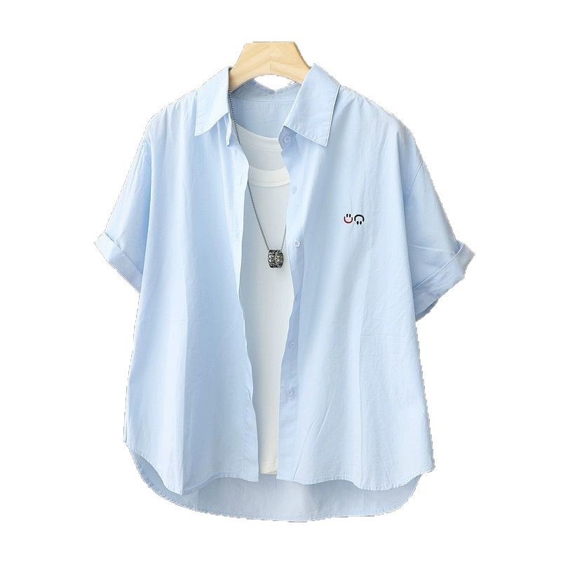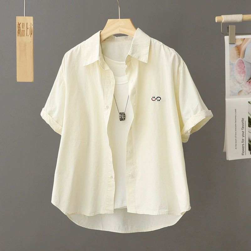 Athvotar Athvotar Korean Version Of Casual Smiley Face Embroidered Short-Sleeved Shirt Women 2025 Spring And Summer New Small Plaid Short Top