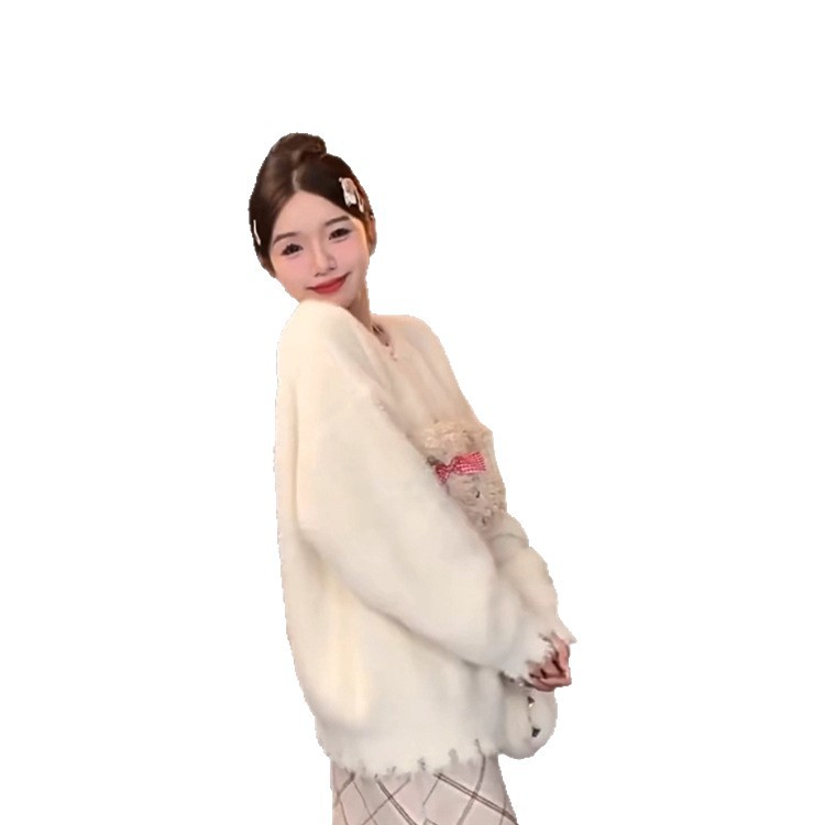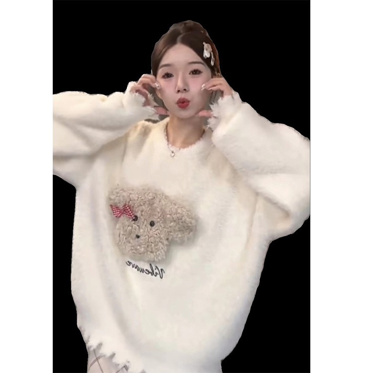 Athvotar Athvotar New Beige Soft-Gried Puppy Splicing Head Horse Sea Hair Sweater Women's Spring And Autumn Lazy Loose Top