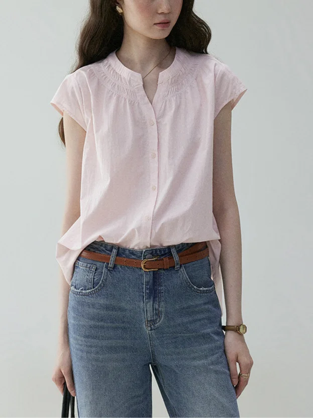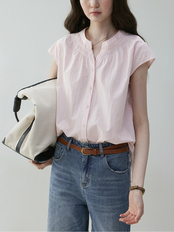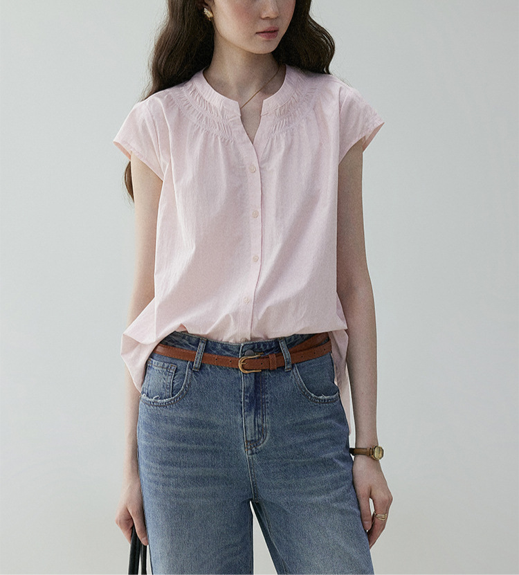 Athvotar Athvotar Round Collar Small Flying Sleeve Commuting Shirt Women 25 Summer French Loose Pressure Fold Design Sense Casual Good-Looking Top