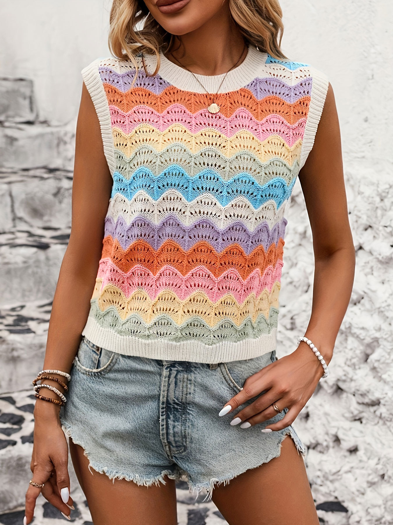 Athvotar Athvotar Sleeveless Knitted Shirt Retro-Colly Rainbow Vest Top Women's Clothing