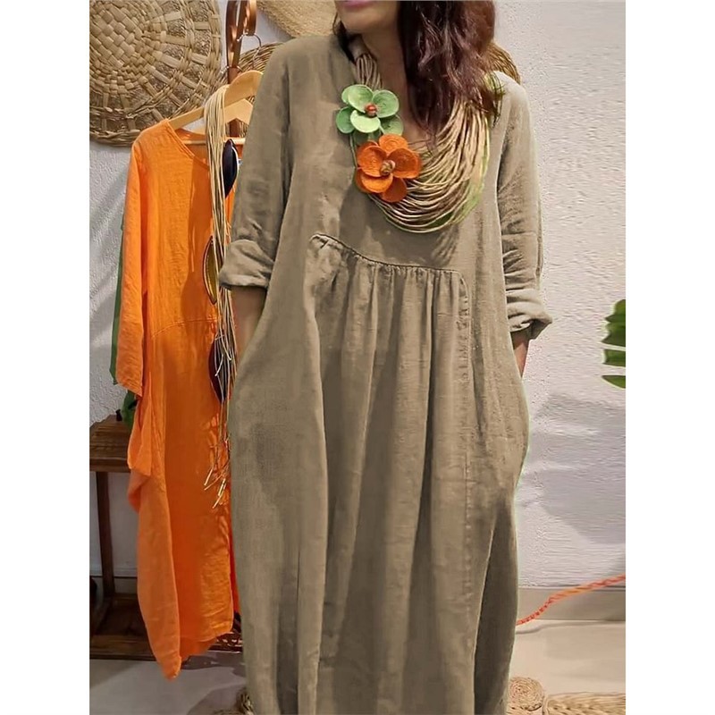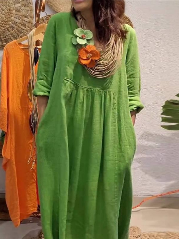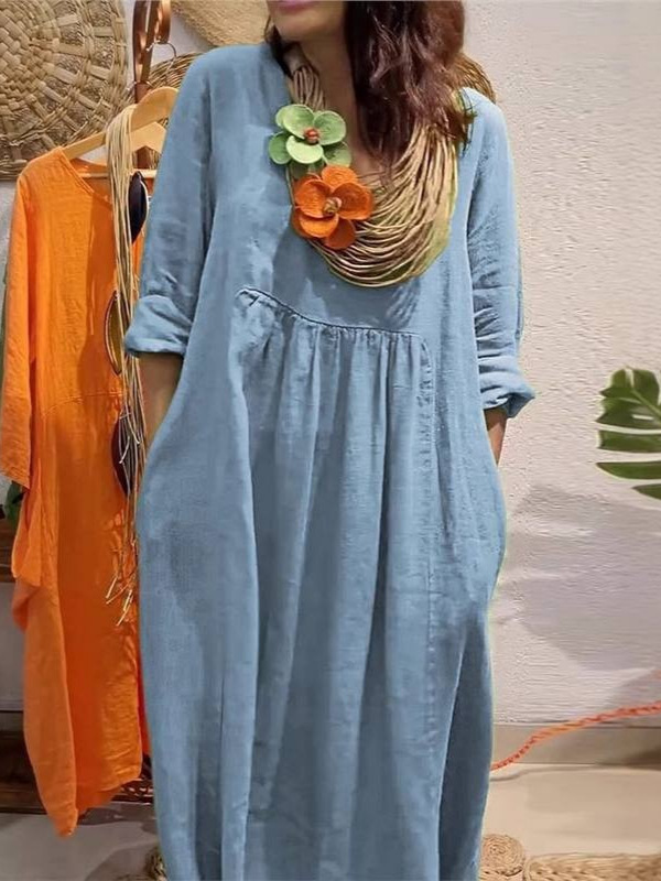 Athvotar Athvotar Spring And Summer Women's V-Neck Casual Solid Cotton Pocket Dress