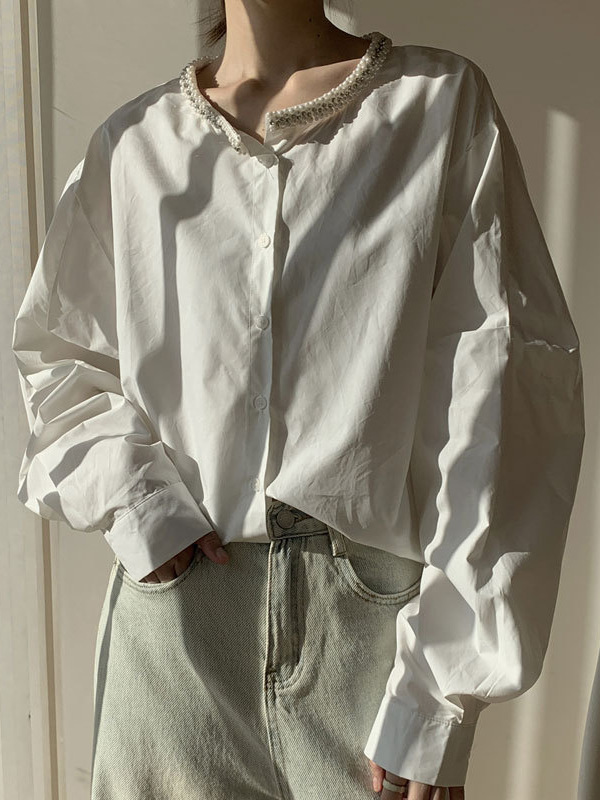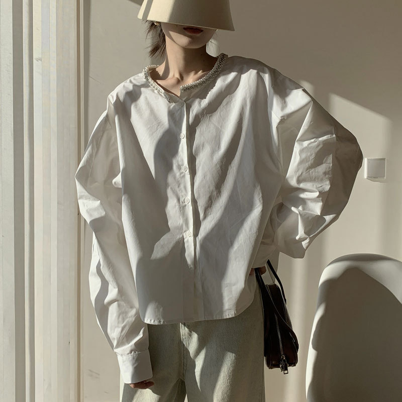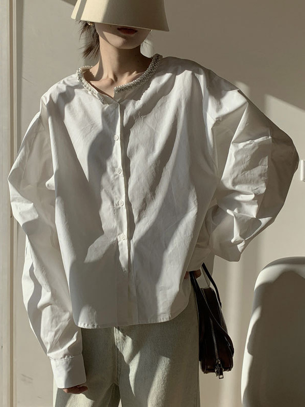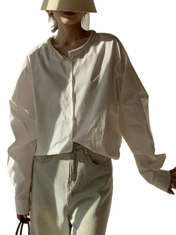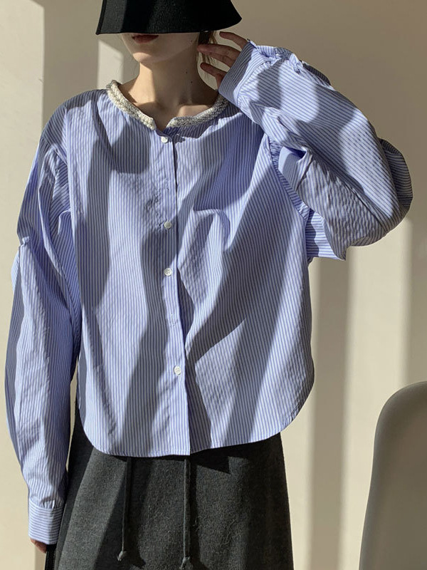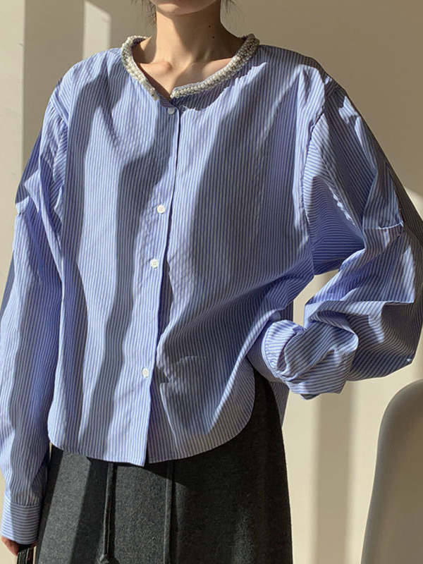 Athvotar Athvotar Spring Round Collar Single Buckle Pearl Necker Casual Striped Shirt Women Casual Ocean Sweet Top