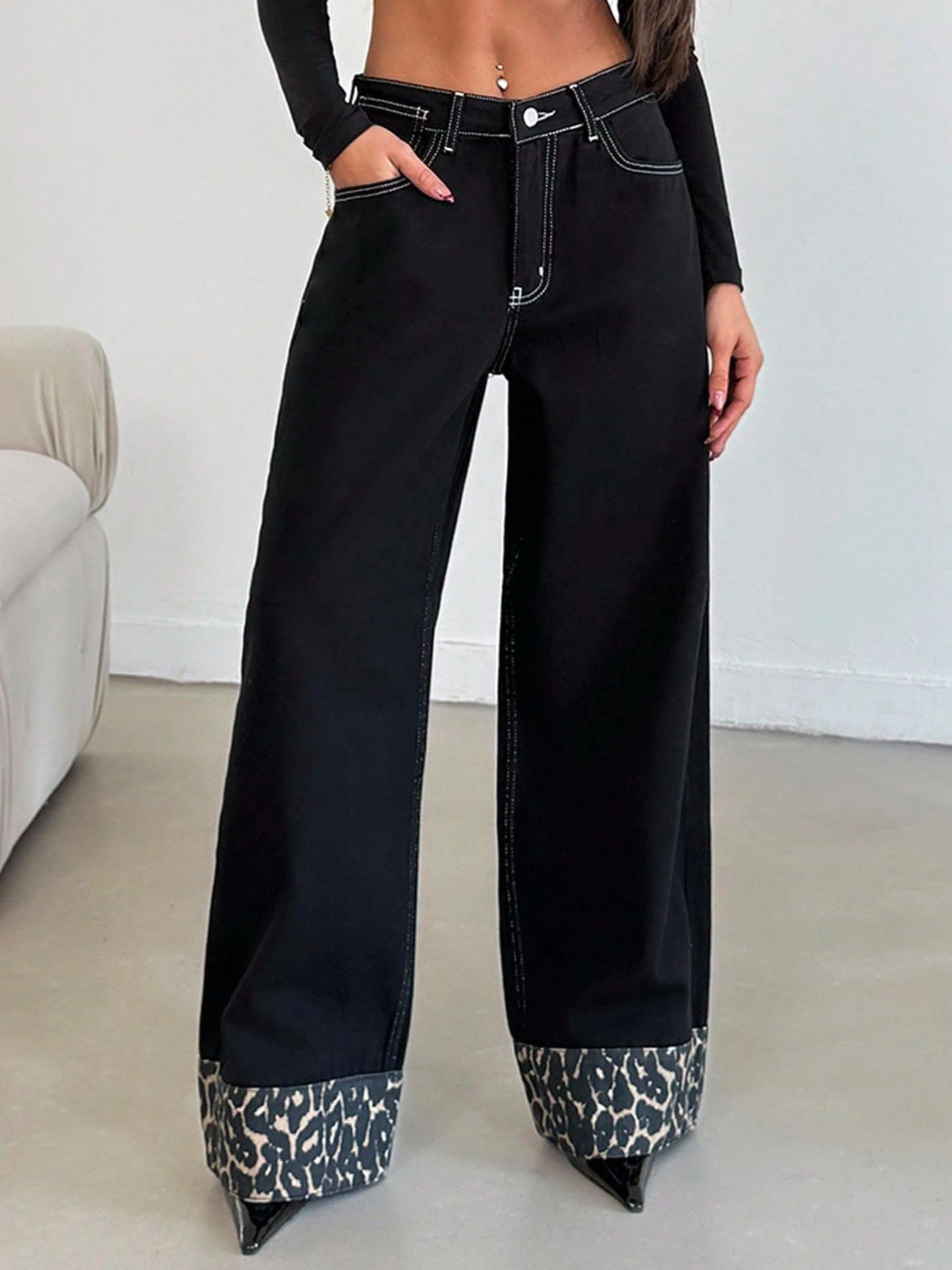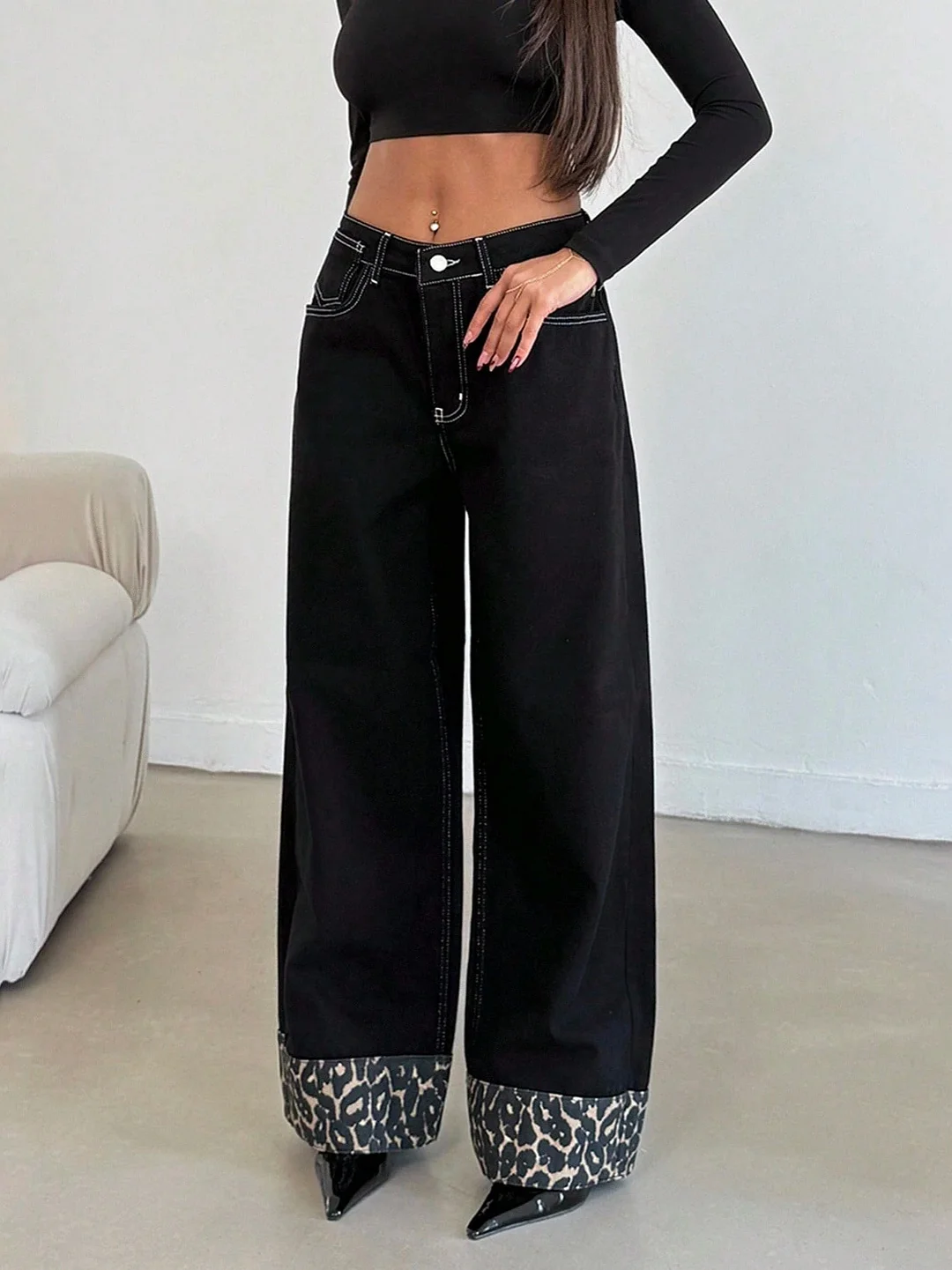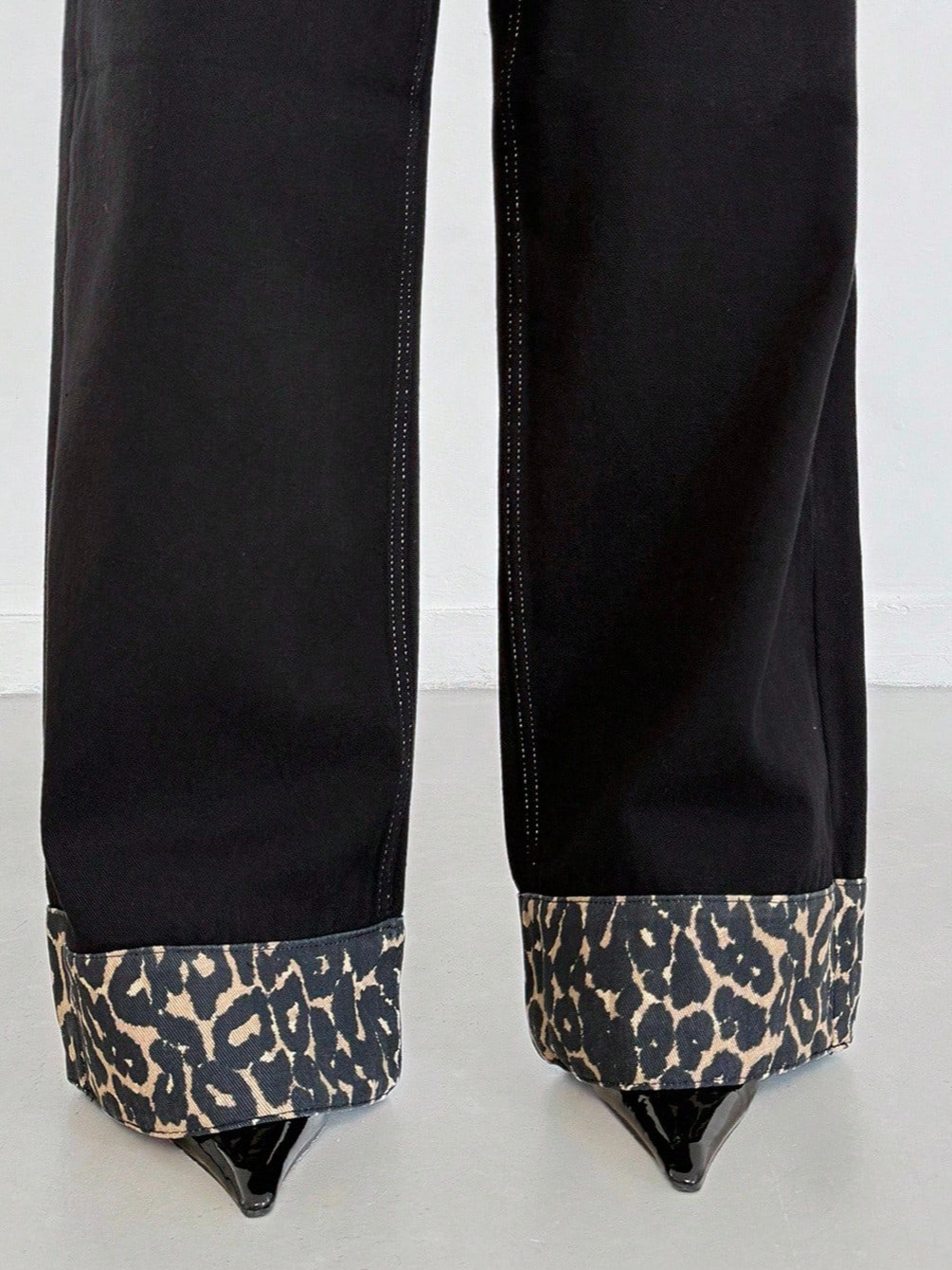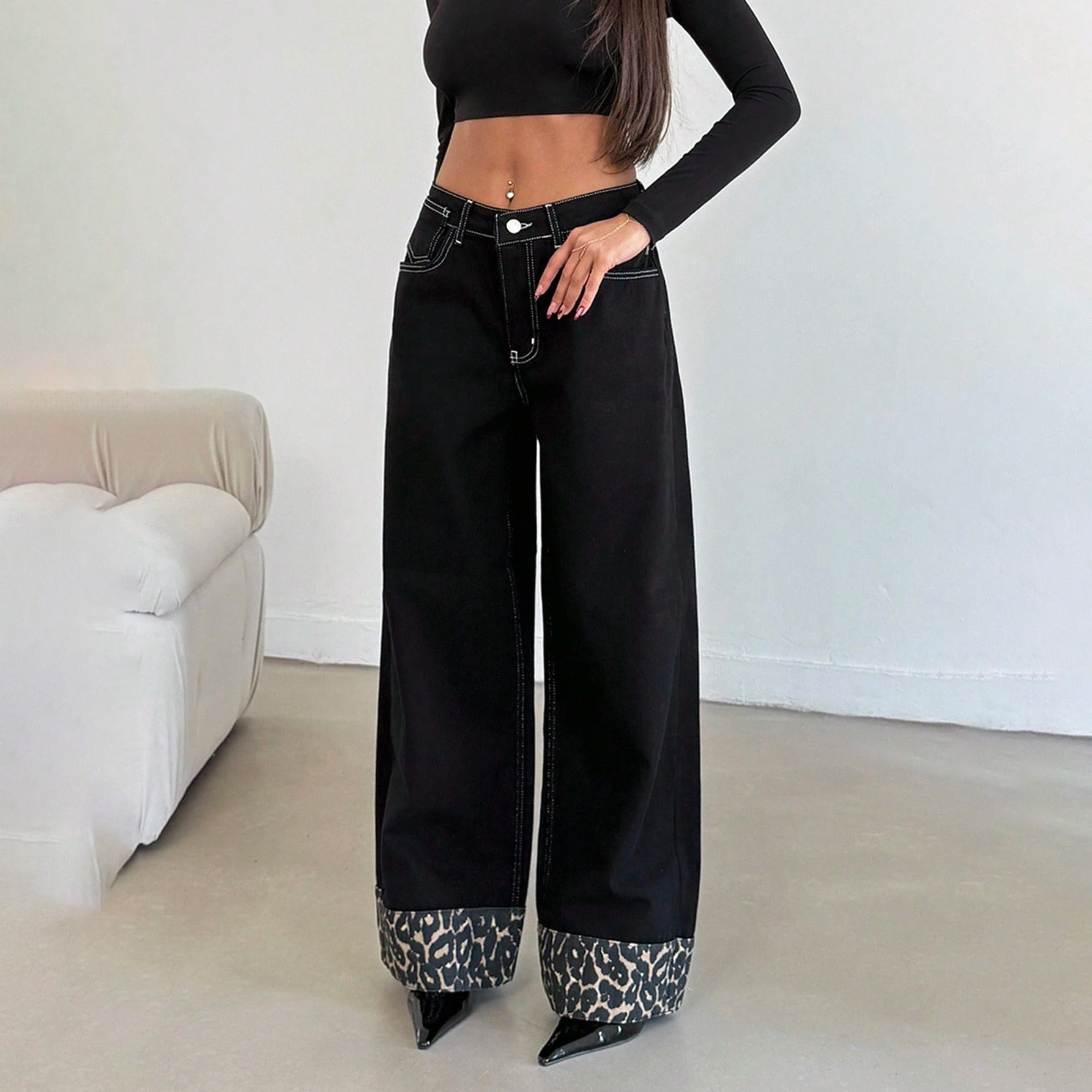 Athvotar Athvotar Straight Trousers Feet Spliced Leopard Trousers Babes Essential Personality Leopard Print Base Black High-Waisted Thin Jeans