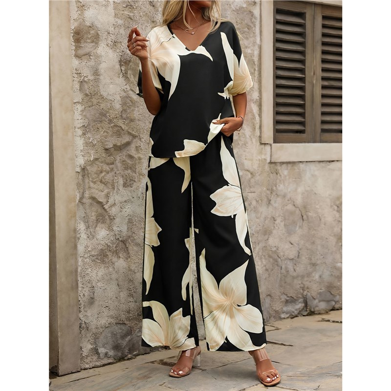 Athvotar Athvotar Summer Set Printing V-Neck Bat Sleeve Blouse Long Pants Fashion Two-Piece