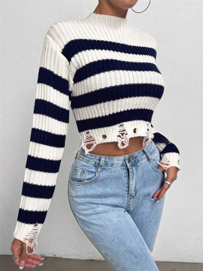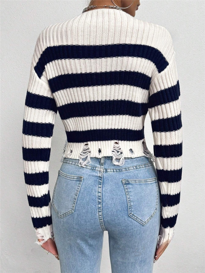 Athvotar Athvotar Women's Clothing Fashion Round Collar High-Waist Short Striped Knitted Short Sweater