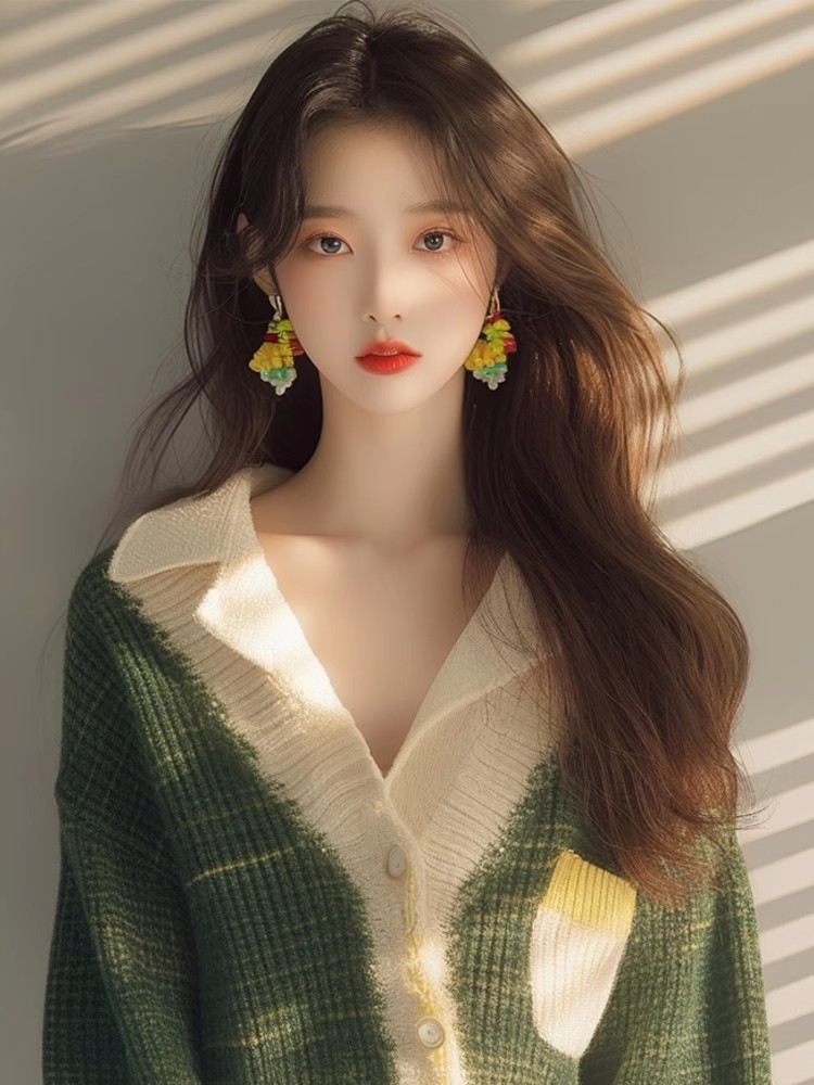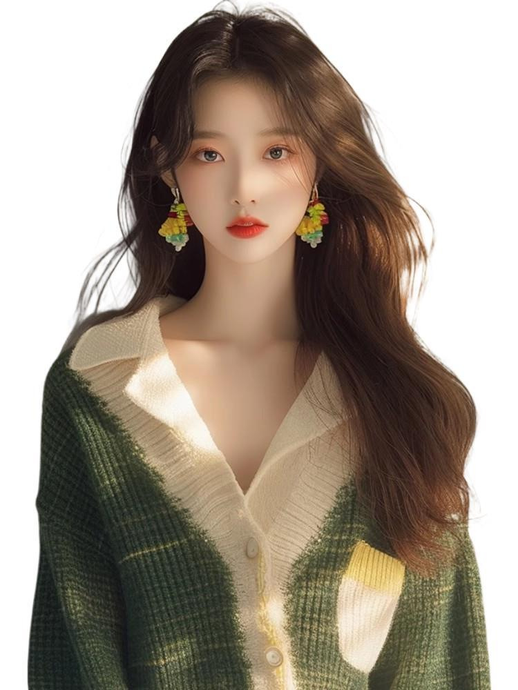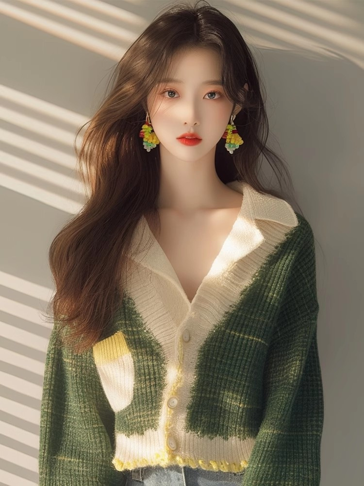 Athvotar Athvotar Year's Popular Beautiful Little Shirt Small Man Fashionable Loose Thin Green V Collar Knit Long Sleeve Open Shirt Woman