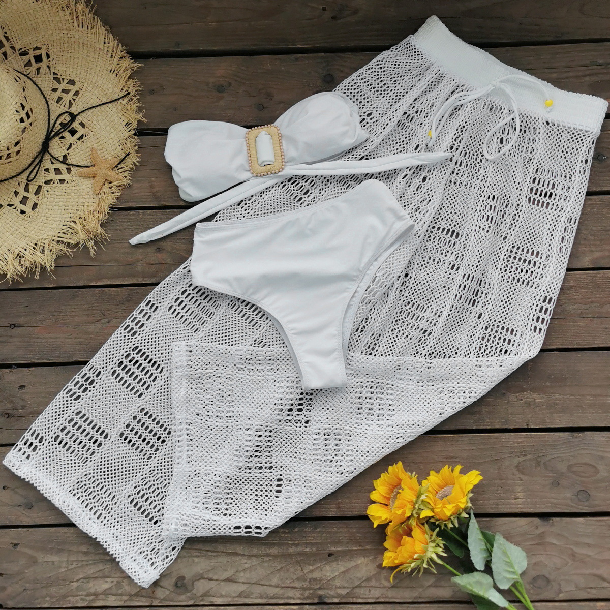 Athvotar Solid Color Strap With Bra High-Waisted Split Swimsuit Bikini Long Net Trousers Three-Piece Set 2025 New