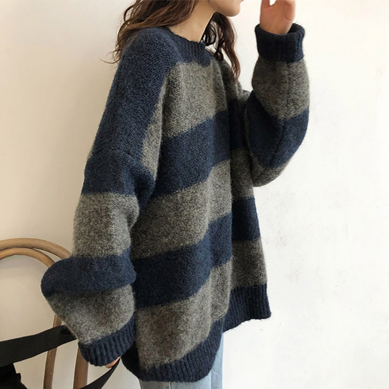 Autumn Striped Knitted Sweaters Women Vintage Loose Pullover Winter Casual Jumper Ladies Oversized Sweater Sueter Mujer 2022