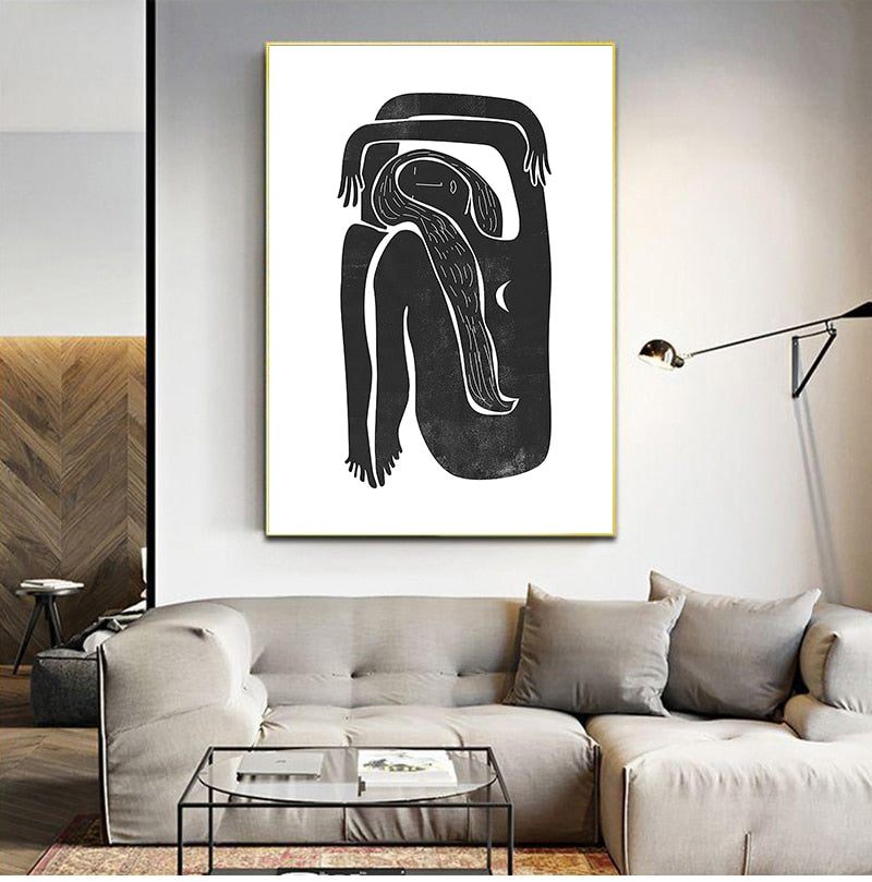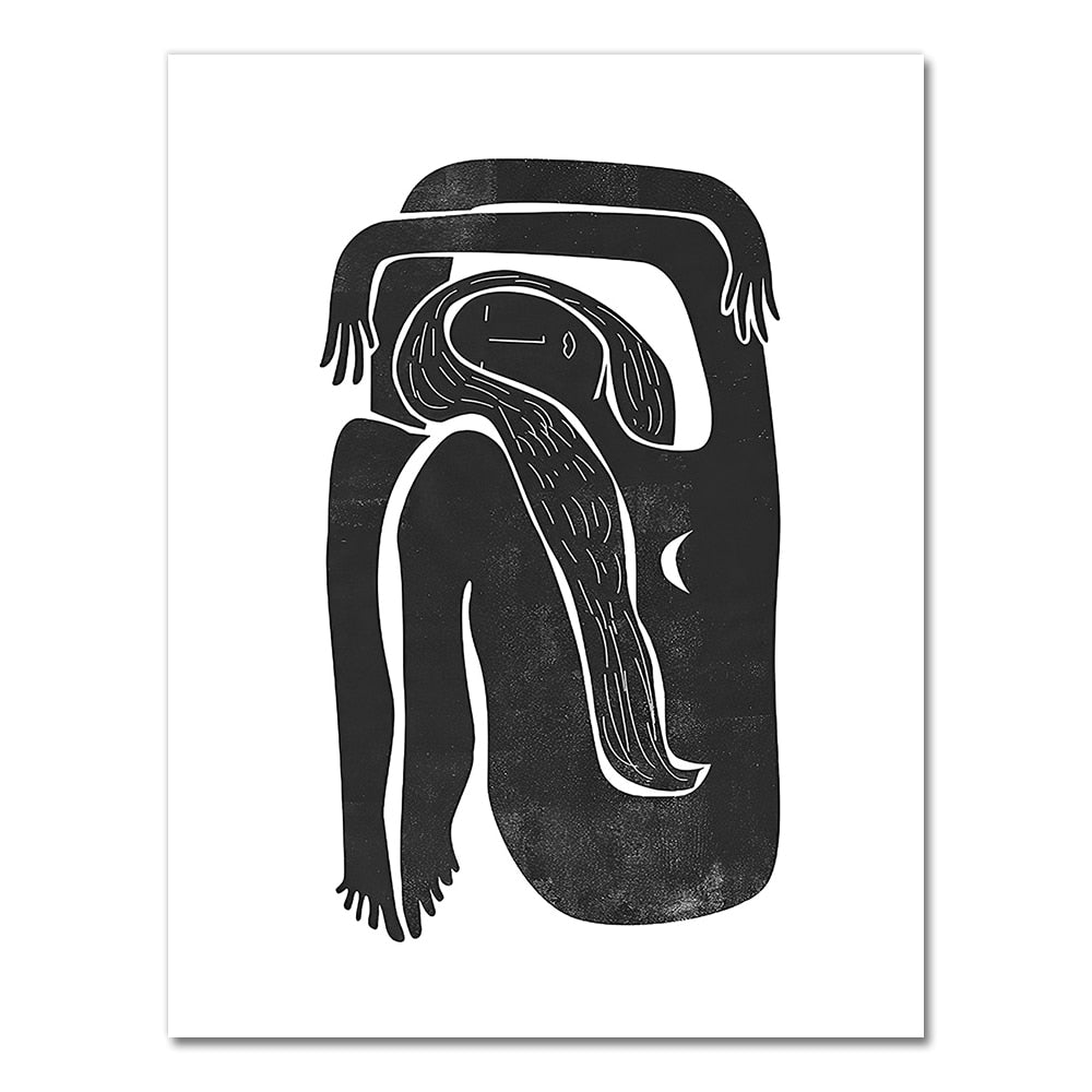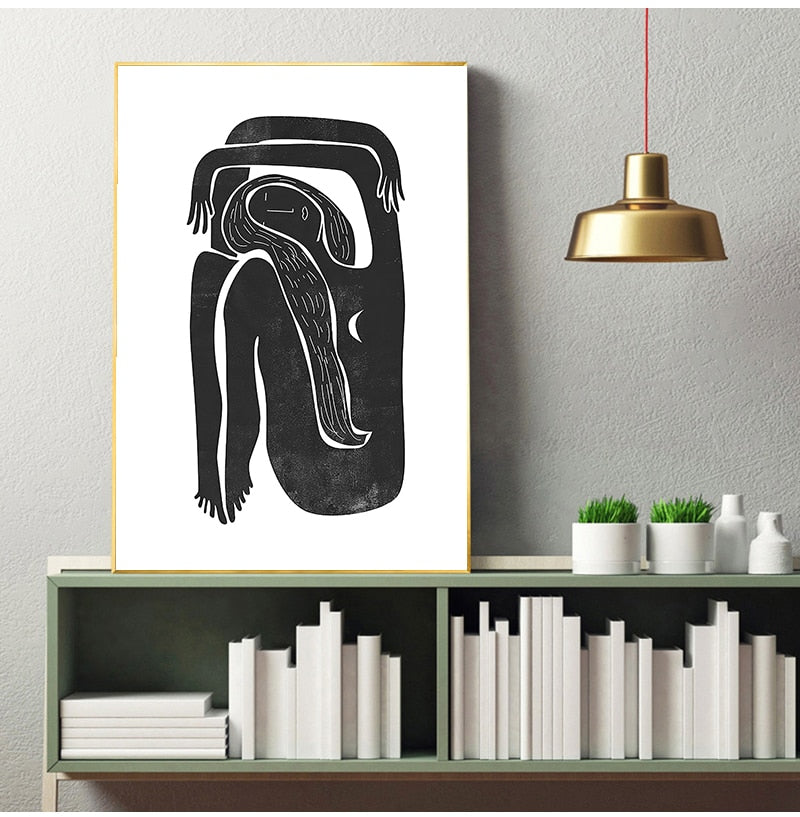 Black and White Minimalist Female Portrait Painting Mid century Moon Posters Boho Art Print Canvas Picture Home Wall Art Decor