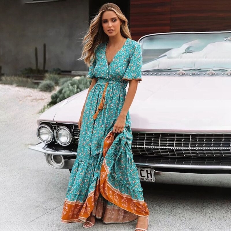 Boho Maxi Dress Women Retro Floral Print Short Sleeve V Neck High Waist Dresses Female Summer Beach Long Dress Ladies Vestidos