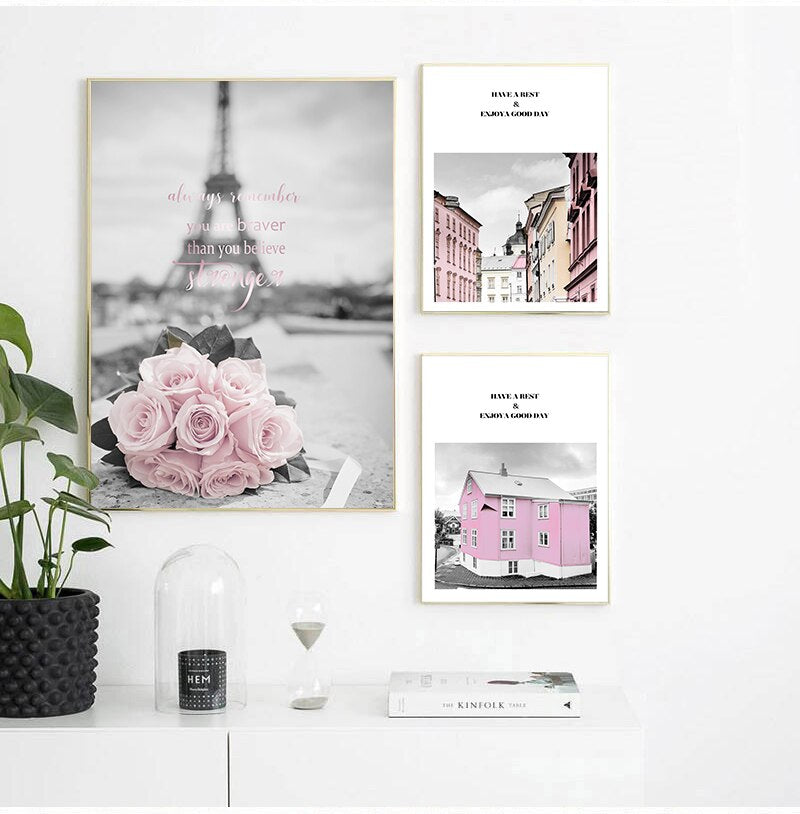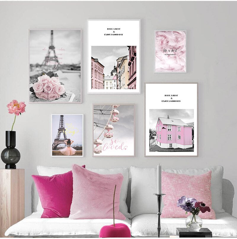 Eiffel Tower Girl Wall Art Canvas Fashion Pink City Landscape Print Painting Nordic Decoration Picture Living Room Decor