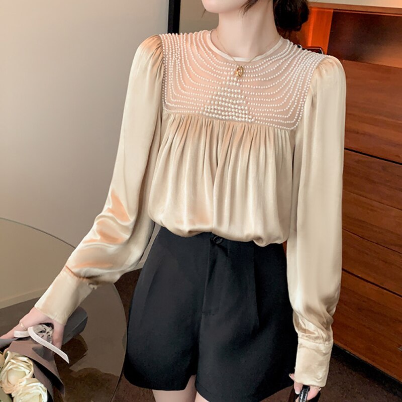 Elegant Mesh Satin Chiffon Shirt Long Sleeve Pleated Loose Vintage Blouse Autumn Casual O-neck Beading Stitching Blouse 17049