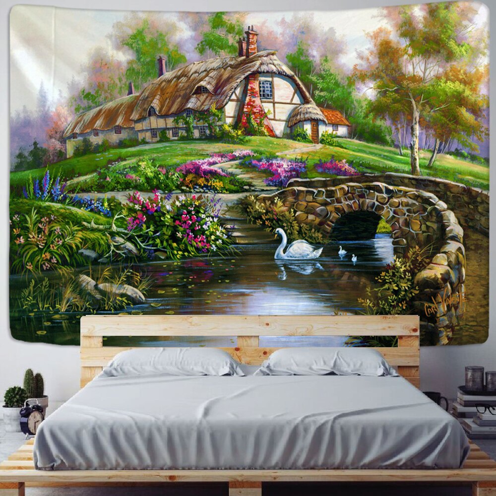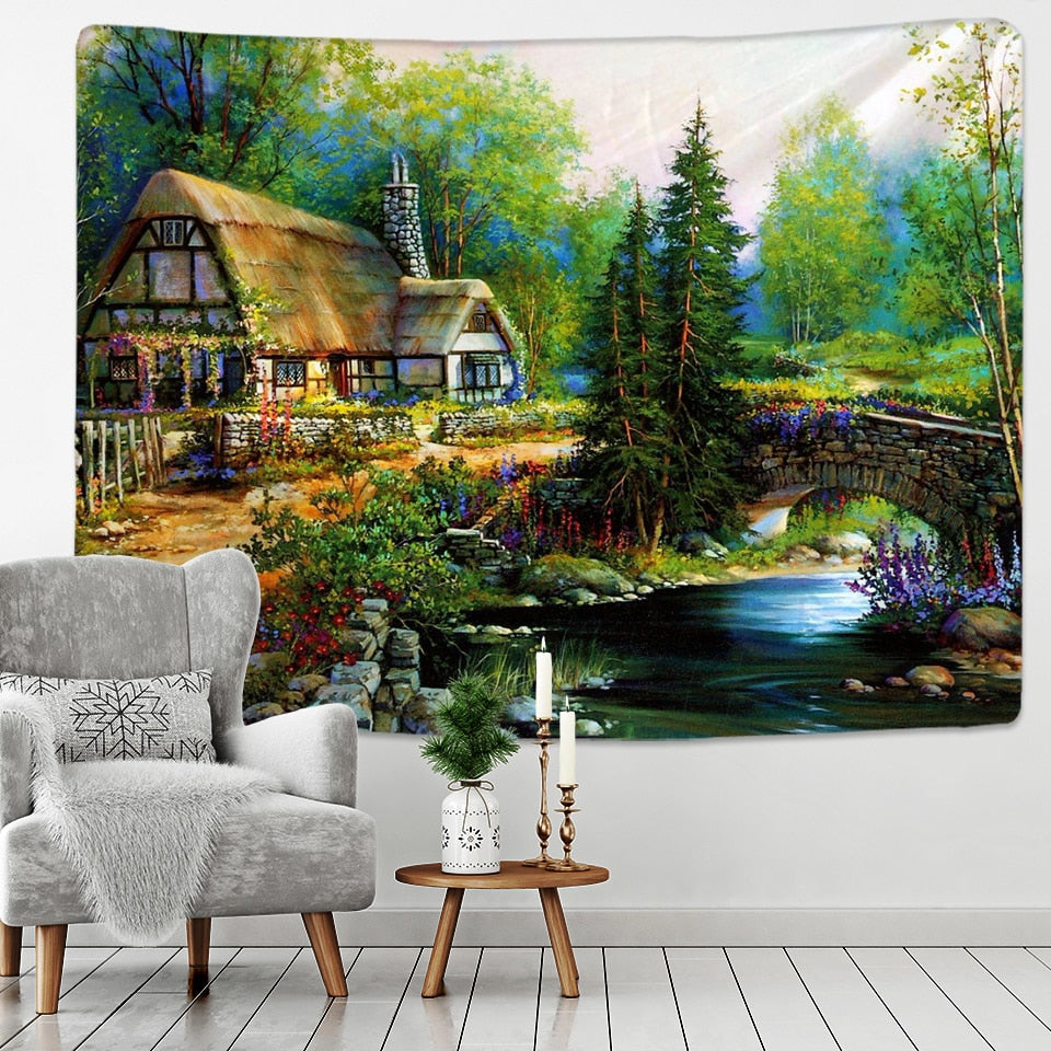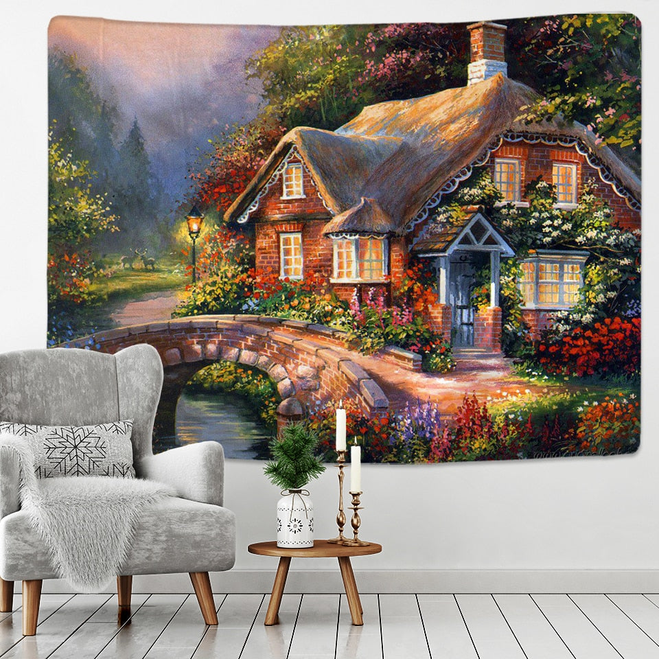 Fairy Tale Cottage Forest Tapestry Wall Hanging Bohemia Art Print Tapestry Room Home Decoration Hippie Pattern