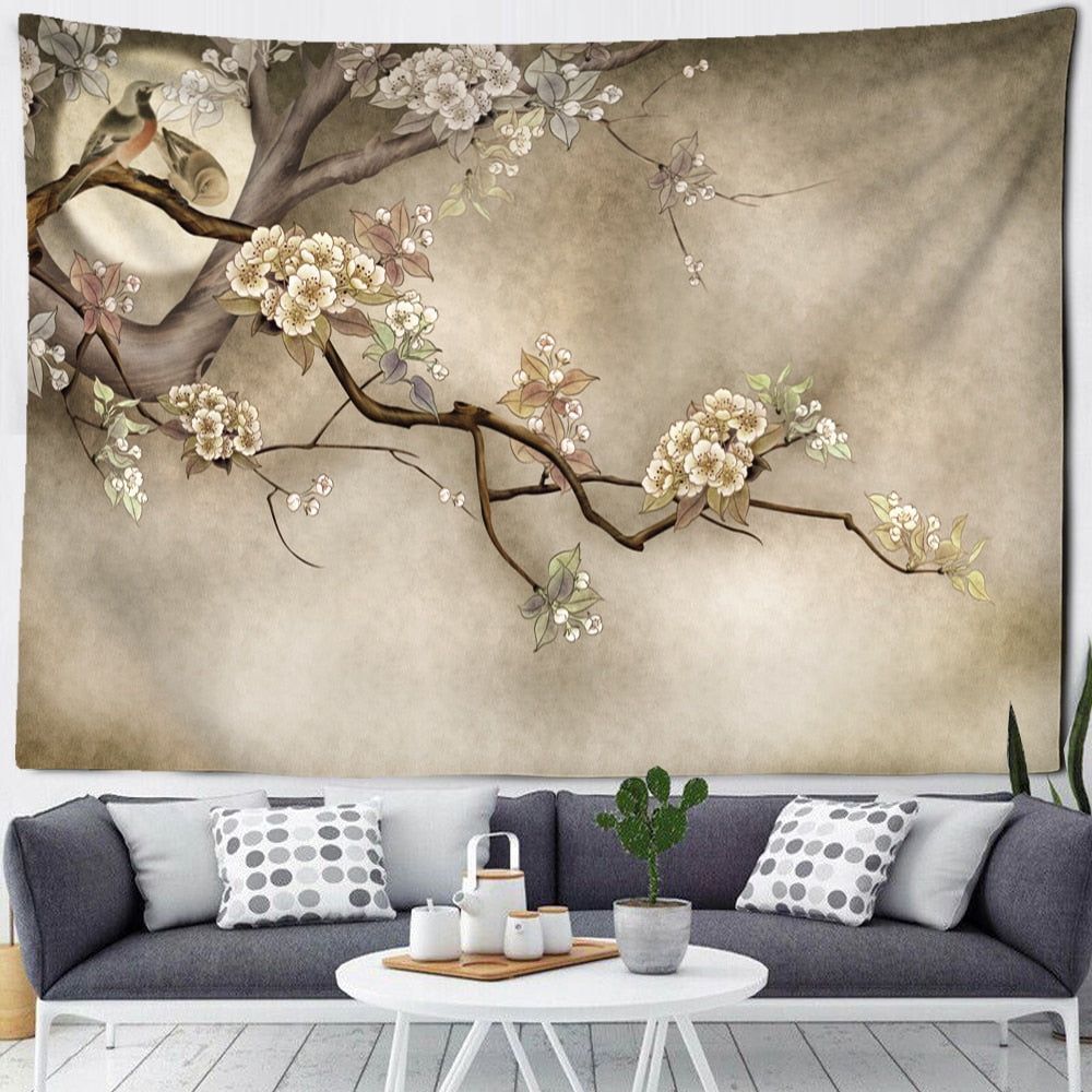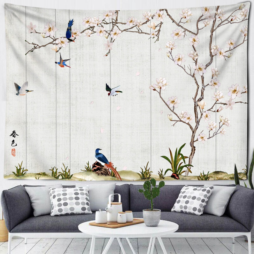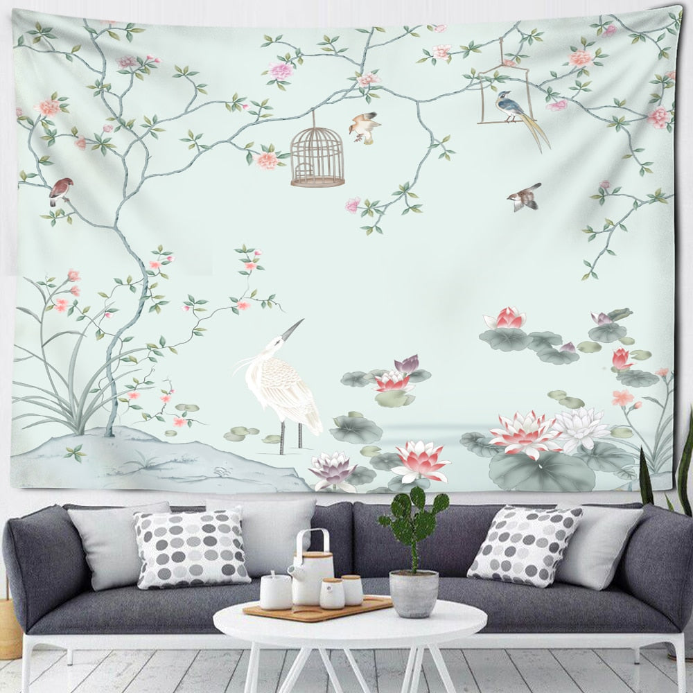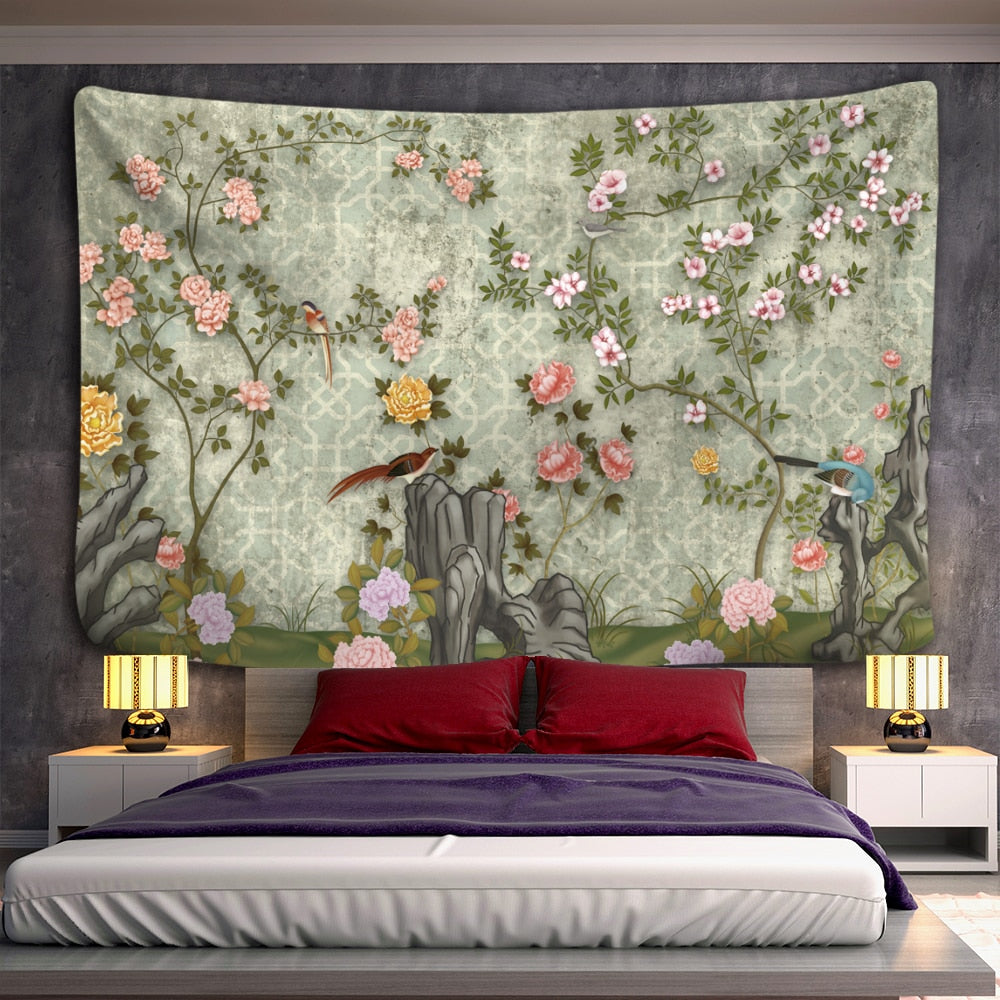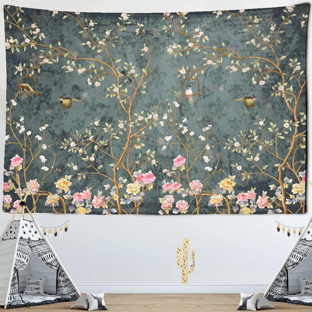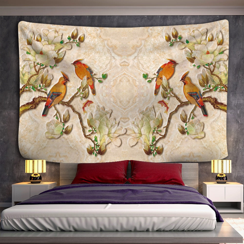 Flower Bird Oil Painting Tapestry Wall Hanging Bohemian Hippie Witchcraft Art Psychedelic Table Mat Home Decor