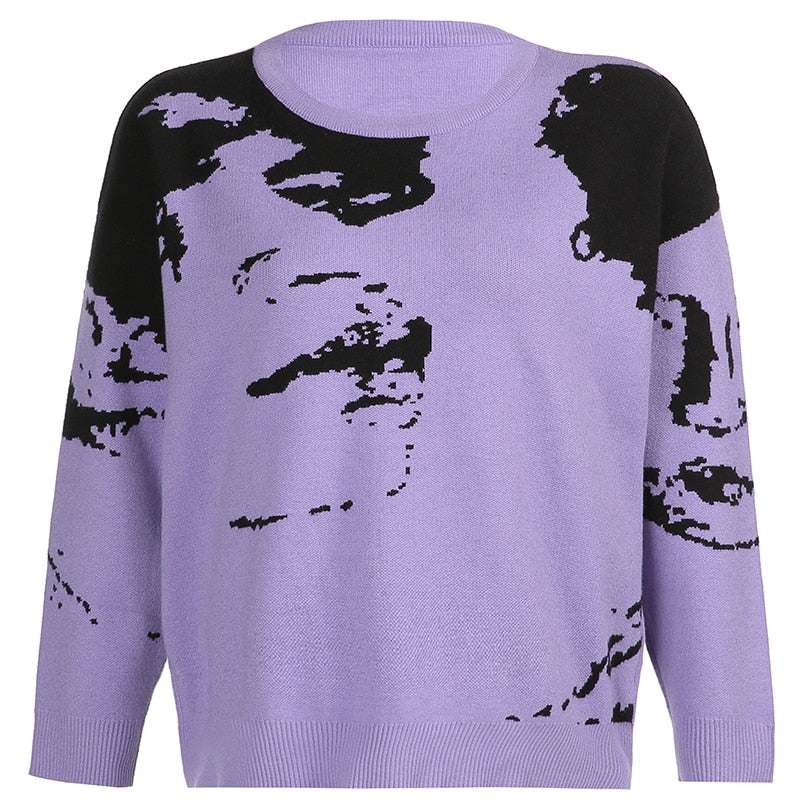 Gothic Women Knitted Sweater Portrait Print Pullover Long Sleeve Round Neck Loose Jumper Y2K Fashion Vintage Knitwear Streetwear
