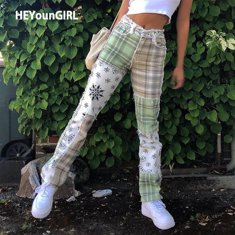 HEYounGIRL Patchwork Vintage Checkered Jeans Women Print Skinny High Waist Denim Pants Ladies Fashion Frill Trousers Female
