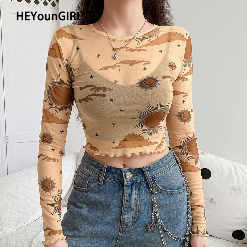 HEYounGIRL Sexy Mesh Long Sleeve T-shirt Women Harajuku Transparent Crop Top T Shirt Ladies Print Streetwear Summer Spring 2021