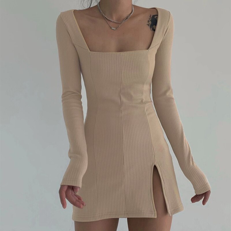 HEYounGIRL Split Side Solid Bodycon Mini Dress Women Square Collar Ribbed Casual Short Dresses Ladies Long Sleeve Korean Fashion