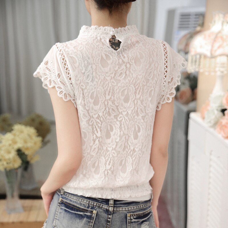 Ladies White Lace Blouse Short Sleeve Stand Collar Women Tops Elegant Patchwork Crochet Women Shirt Plus Size Blusas Mujer 01C