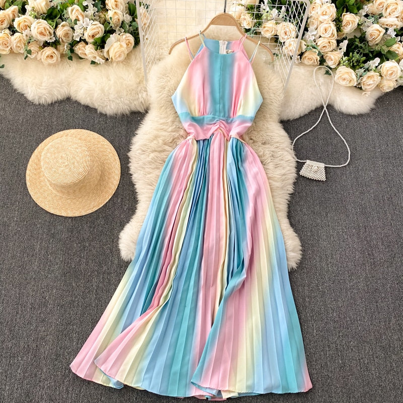 Long Dresses For Women 2021 Gradient Color Vacation Boho Beach Summer Dress Sleeveless Halter Spaghetti Strap Sexy Pleated Dress