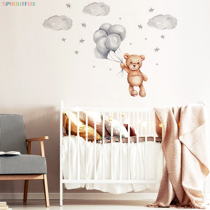 Lovely Bear with Ballon Bedroom Wall Stickers for Kids Rooms Girls Nursery Decoration Cloud Stars Viny Mural Stickers