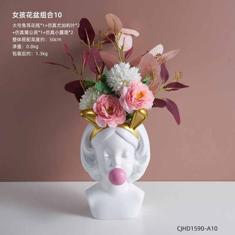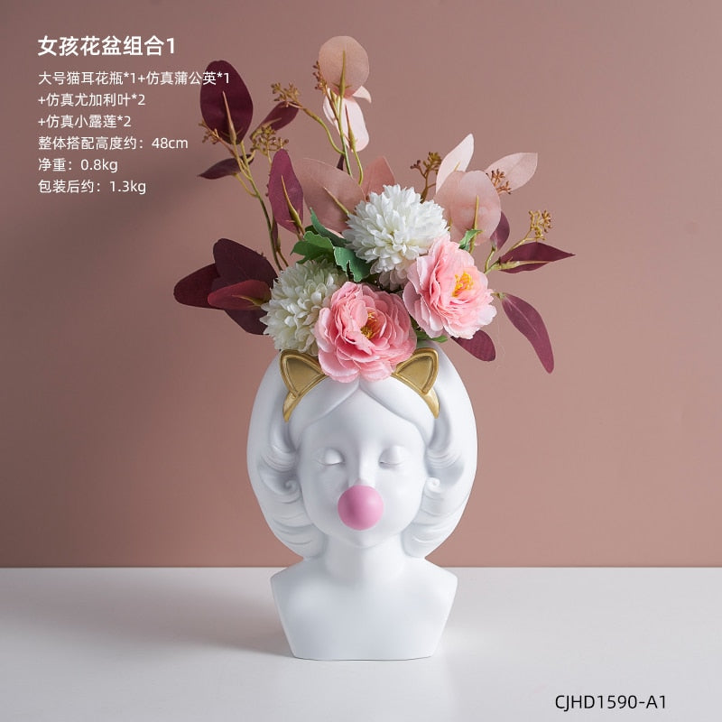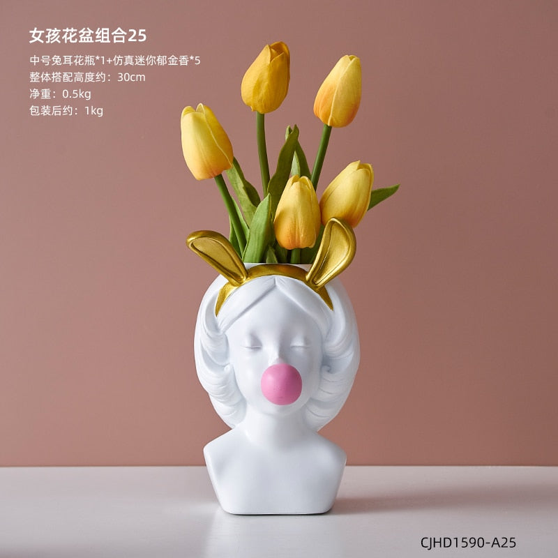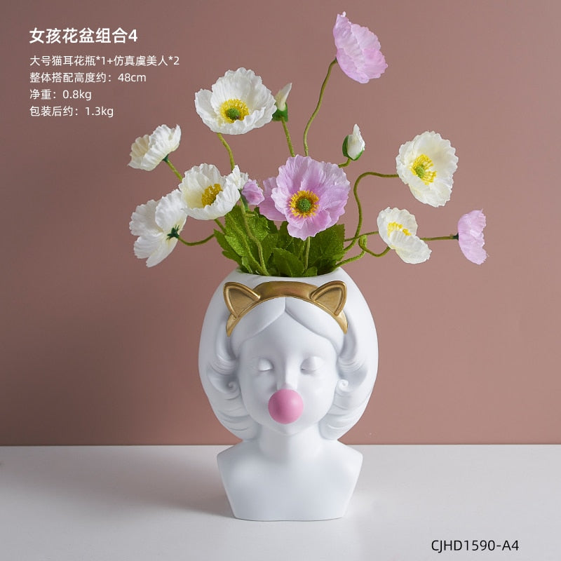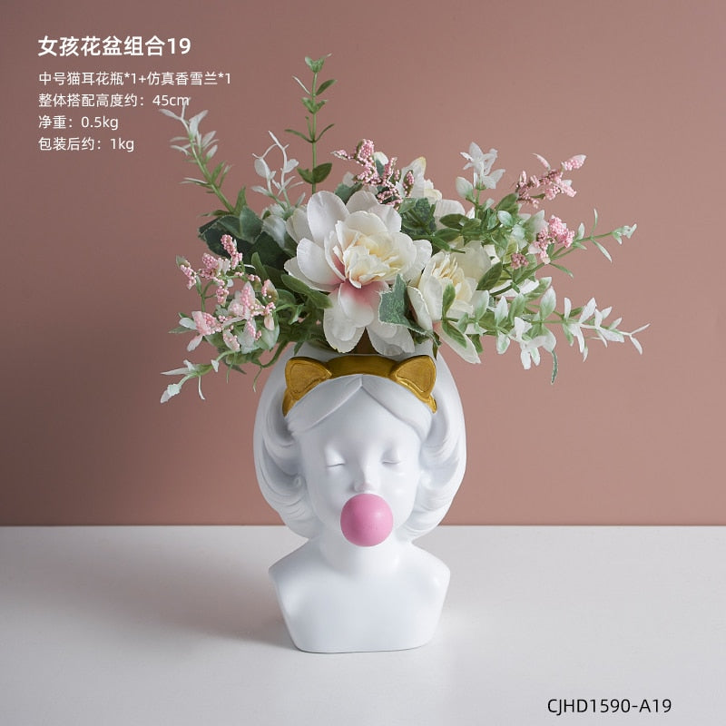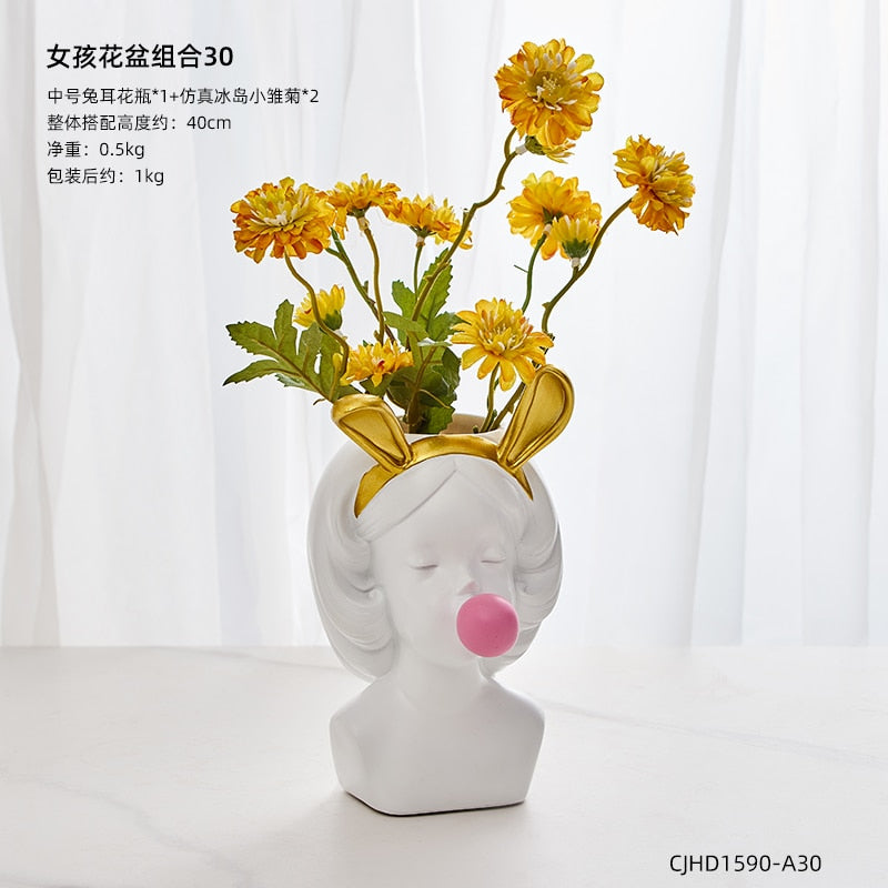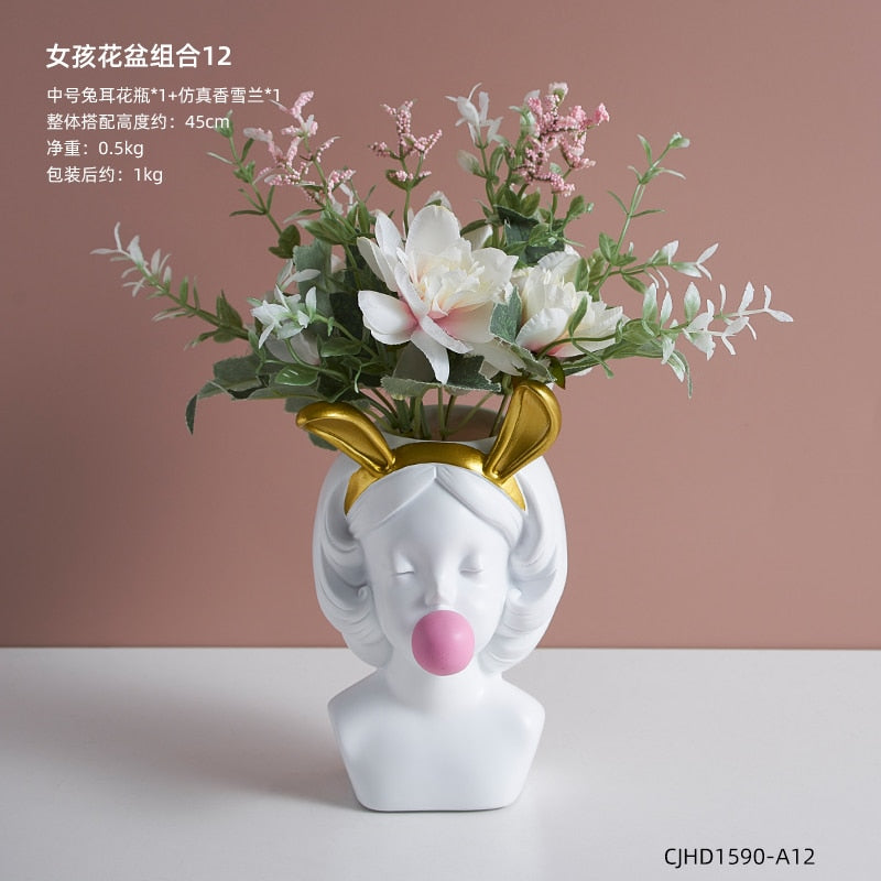Nordic style girl flower pot plant resin flower pot rabbit ear/cat ear girl potted modern living room decoration decoration gift