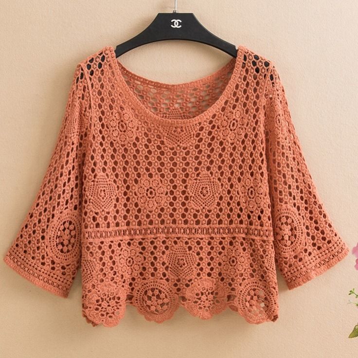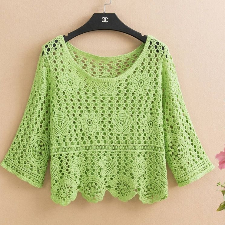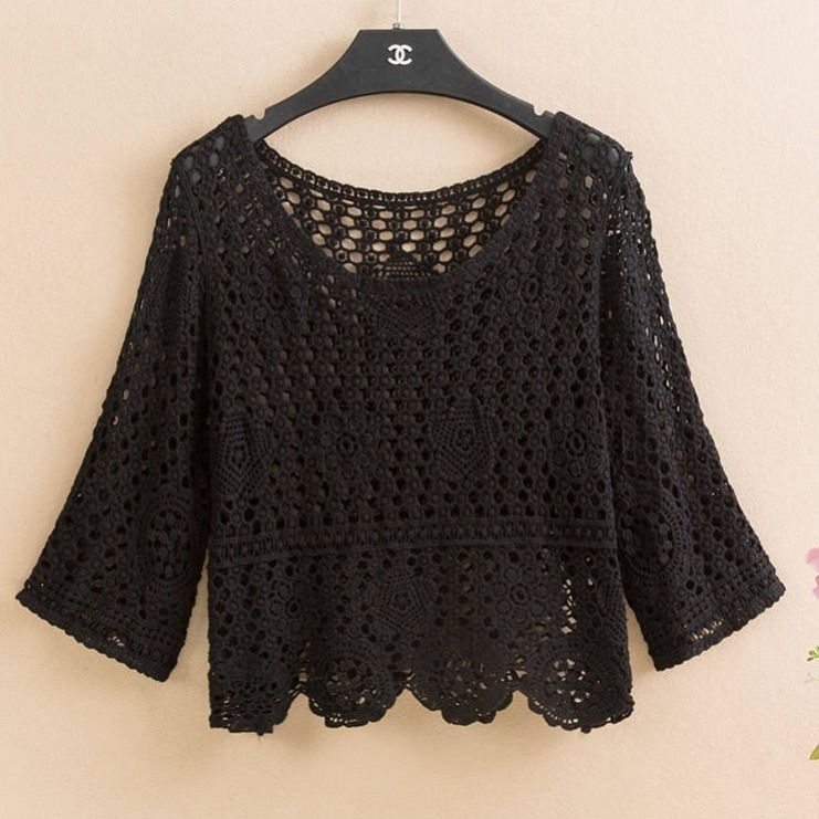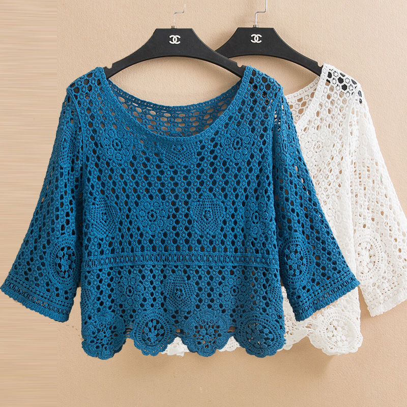 Pullover summer short hedging knitted hollow flower small outer super fairy all-match lace top