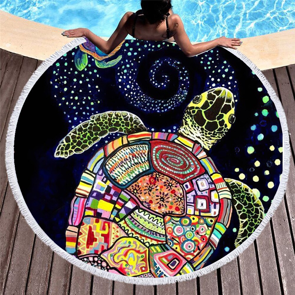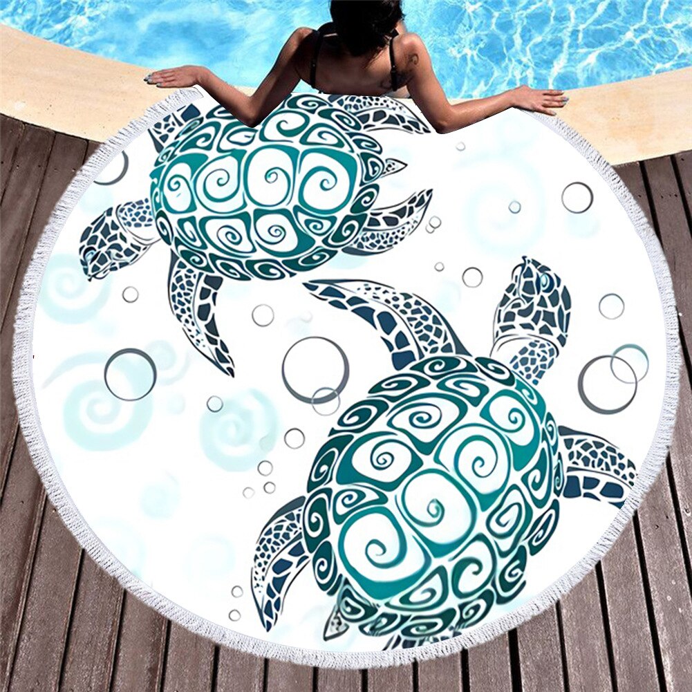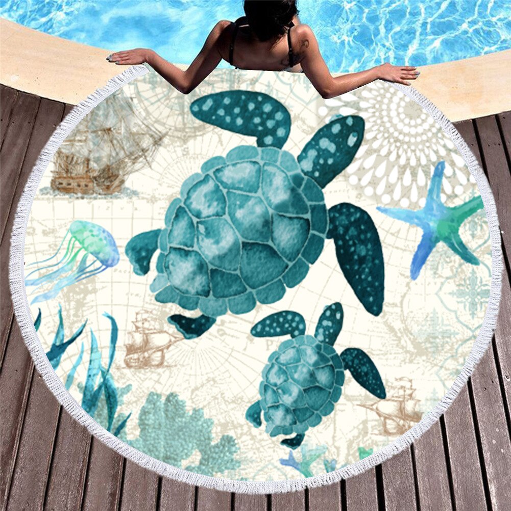 Sea Turtle Printed Round Beach Towel Microfiber Compressed Bath Towel For Adults Kids Summer Quick-Dry Beach Towel With Tassels