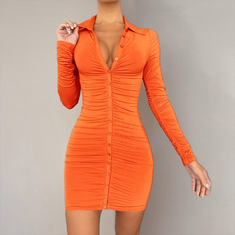 Sexy Bodycon Mini Shirt Dress Long Sleeve Solid Color Outfit Button Down Lapel One-Piece Ruched Women Slim Fashion Clubwear 2021