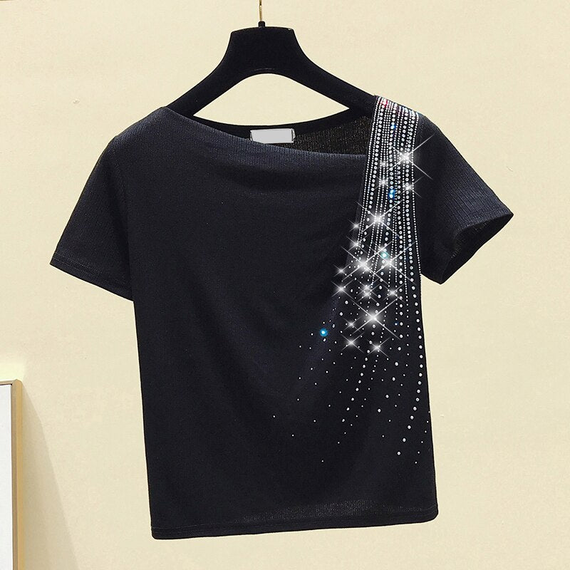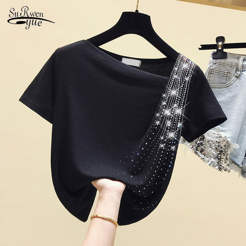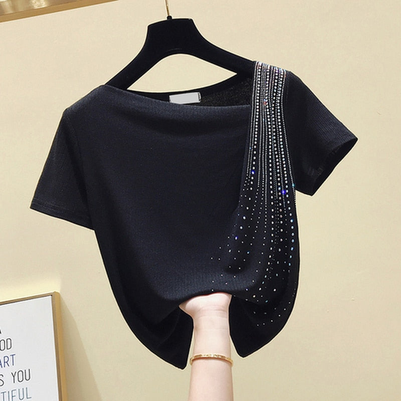 Solid Short Sleeve Tee Tops Casual Women Clothing Spring Summer New Irregular Diamonds Tops Black Blouse Femme Blusas 10016