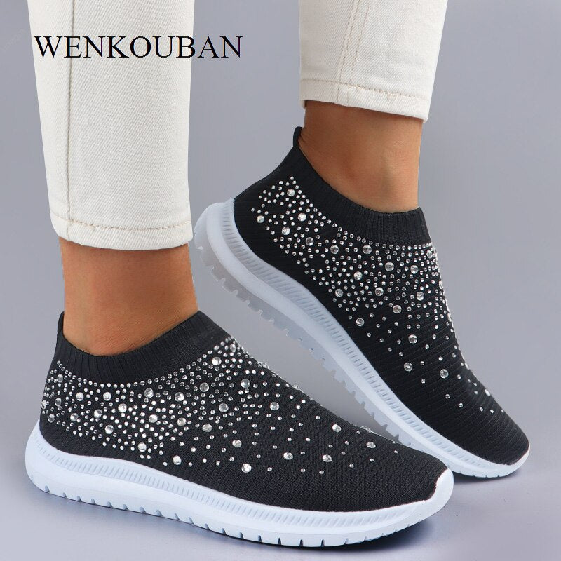 Summer Sneakers Women Sock Shoes Crystal White Sneakers Casual Slip On Flats Ladies Trainers Walking Shoes Basket Femme 2021