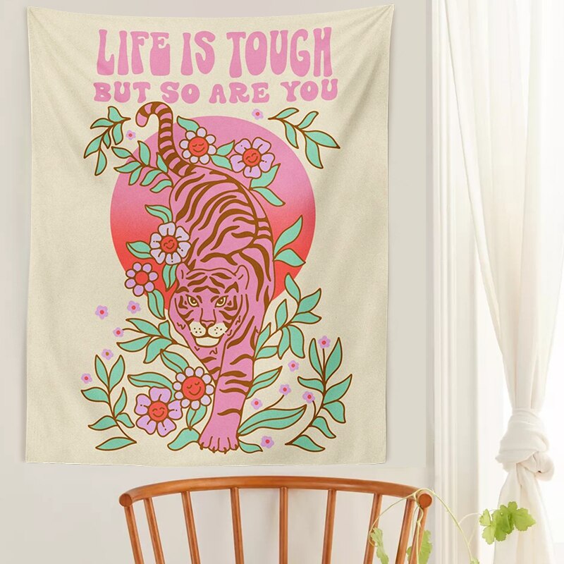 Tiger Moon Wall Tapestry flower plant Wall Hanging pink Aesthetic Room Decor Psychedelic Boho background Tapestries Home Decor