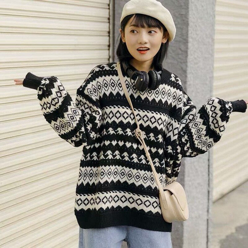 Vintage Sweaters Women Winter Pullovers Striped Knitted Sweater Oversized Jumper Ladies Casual Loose Long Sleeve Sueter De Mujer