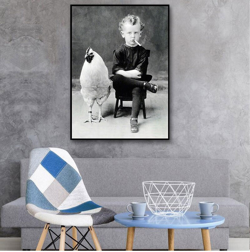 Weird Vintage Photography Poster Prints , Boy Smoking With His Chicken Pet Antique Portrait Art Canvas Painting Wall Art Decor